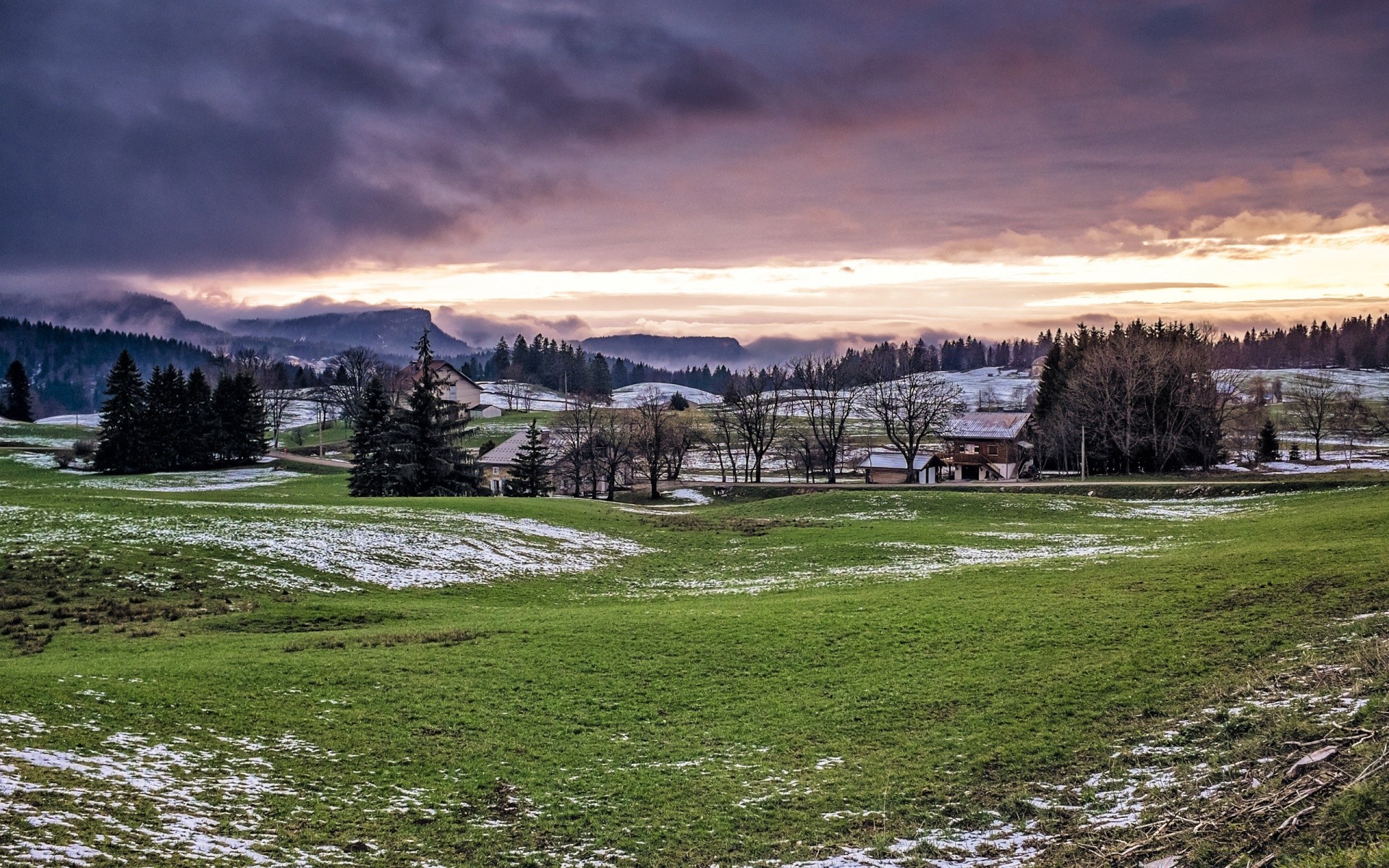 Landschaft von grünen Wiesen und Wolken , aus denen es regnet