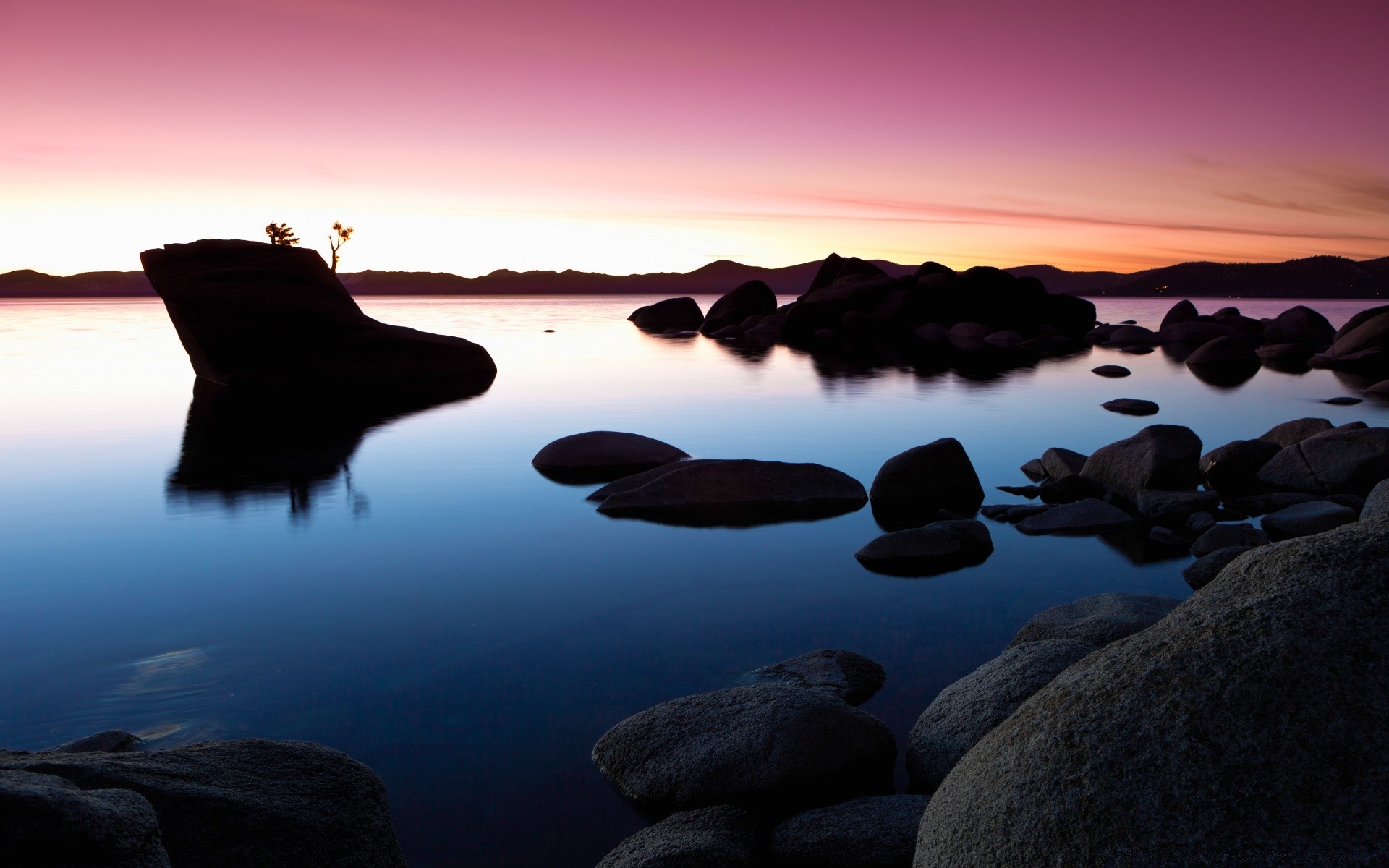 Sonnenuntergang in Amerika vor dem Hintergrund von Wasser und Steinen
