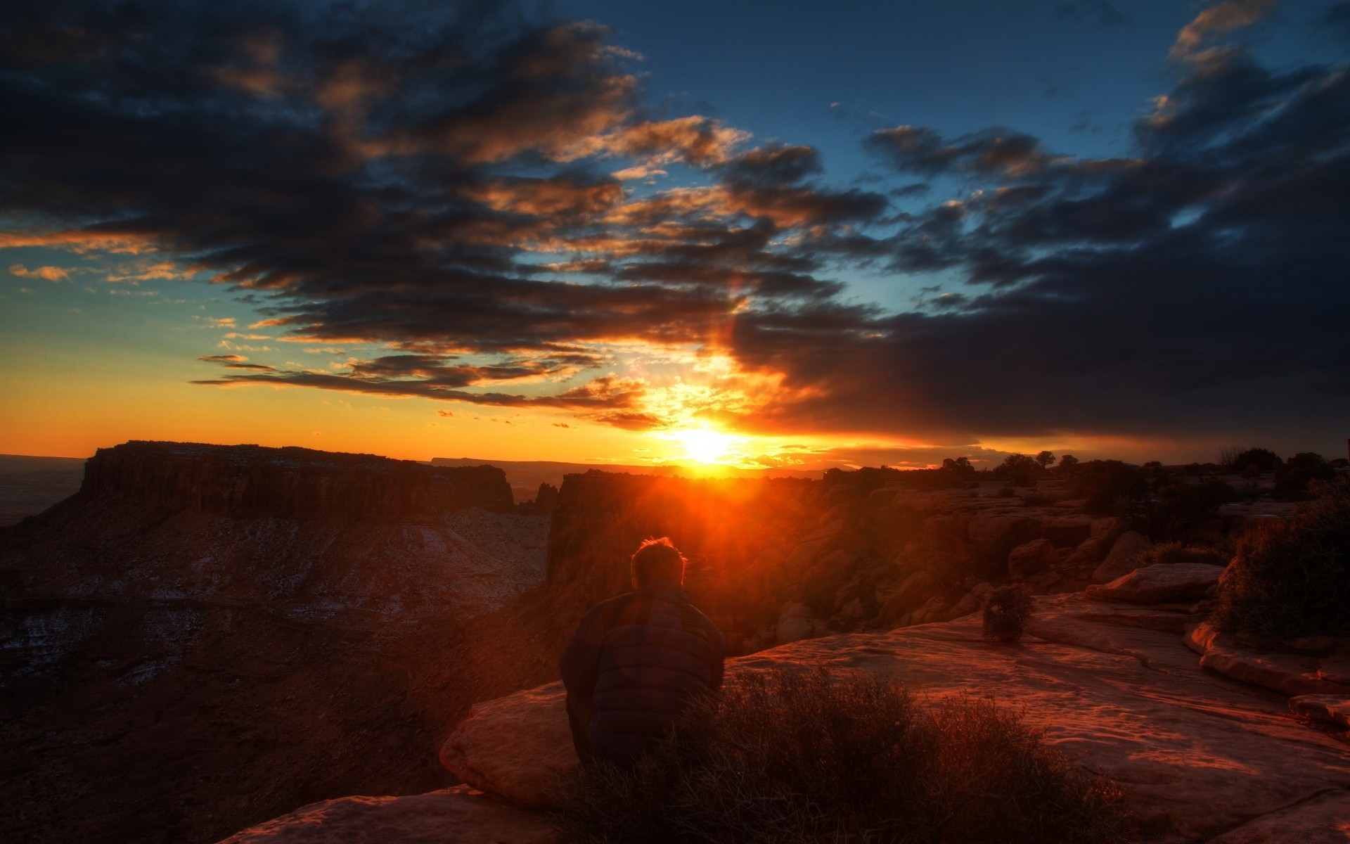 Der mann, der sitzt, bewundert den sonnenuntergangDer Mann, der sitzt, bewundert den Sonnenuntergang