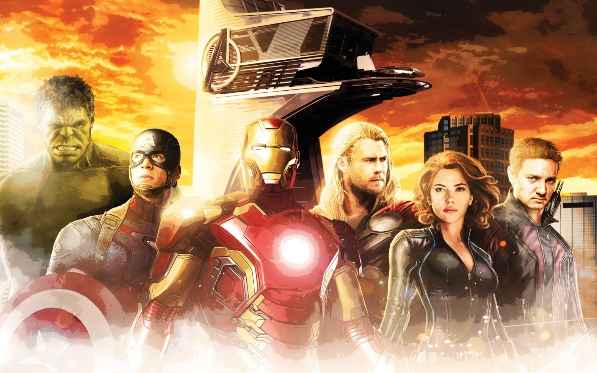 Sechs Helden der Avengers im Hintergrund des Hauptquartiers