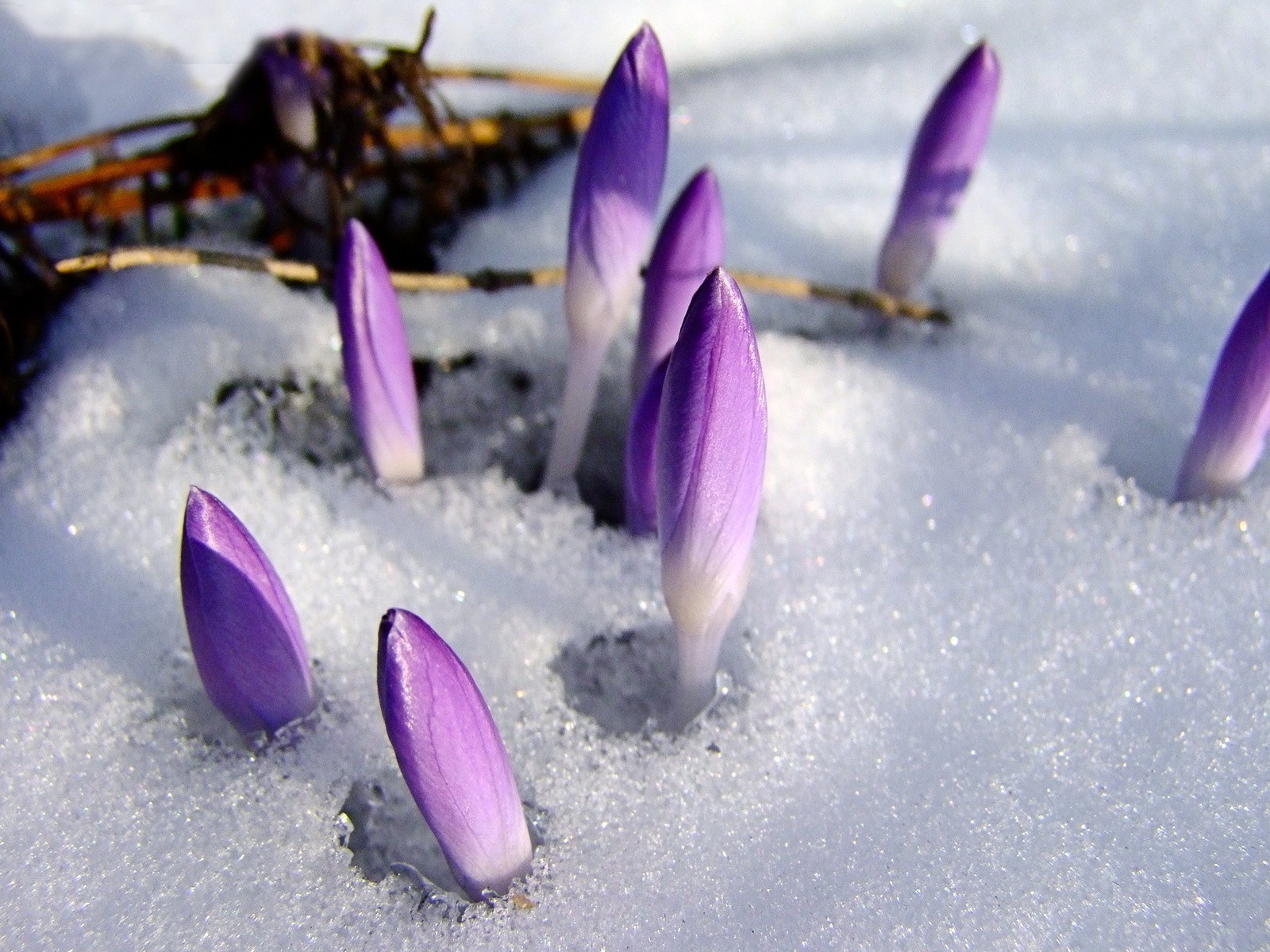 Lila Blüten, die sich durch die Schneekruste schleichen