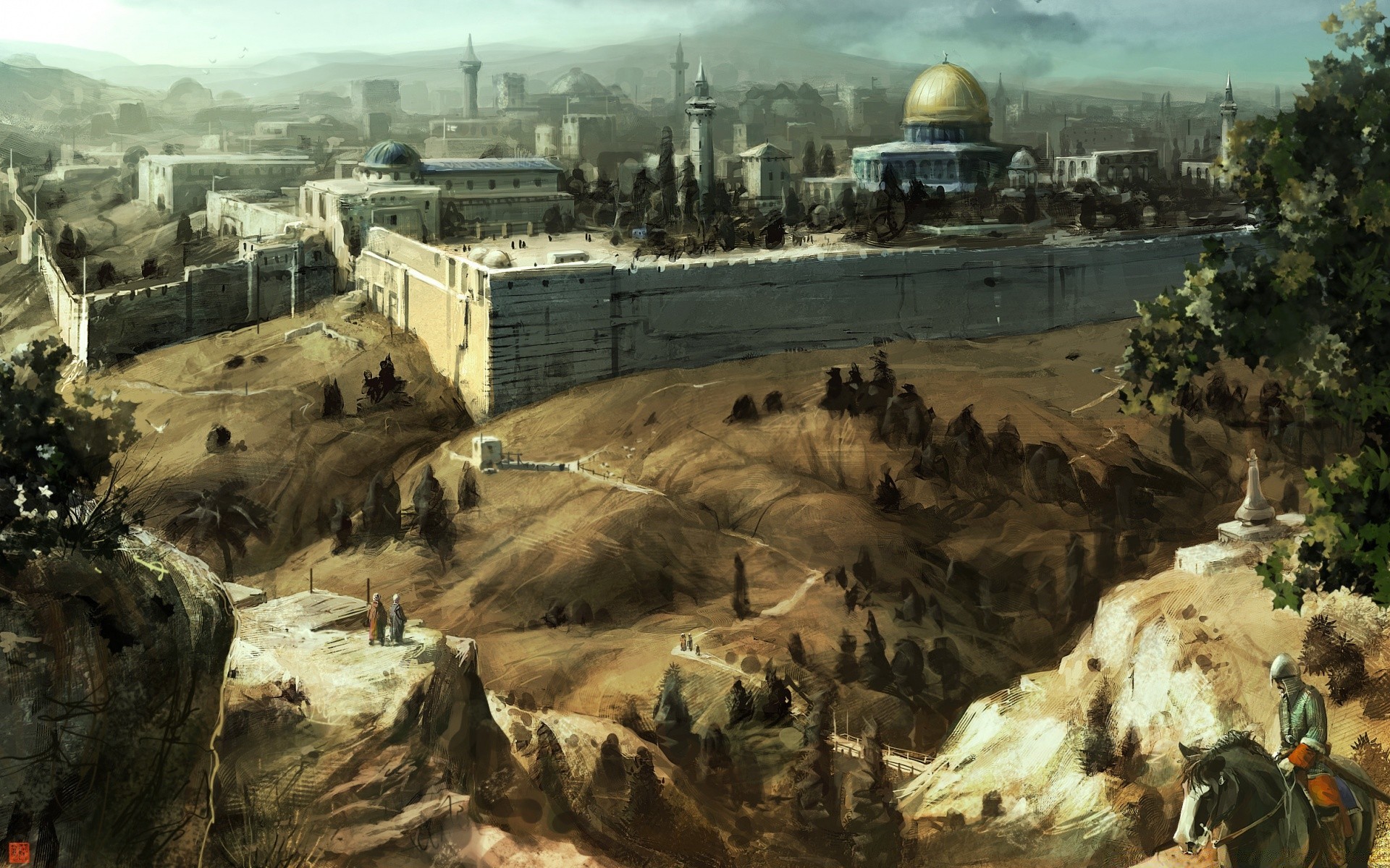 Ein Assassin's creed-Charakter mit einem Säbel steht auf dem Dach