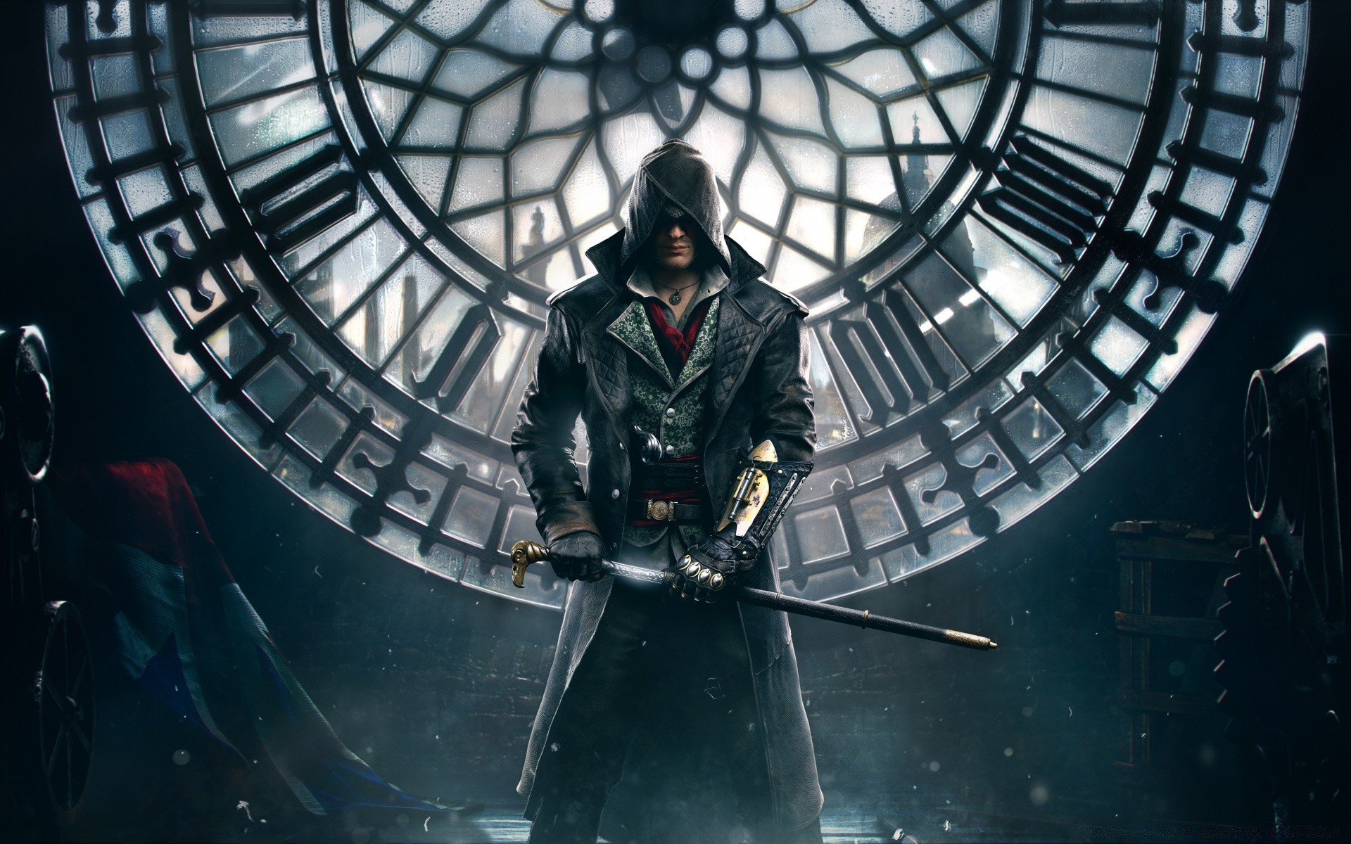 Bild aus dem Spiel Assassin s creed Man auf dem Hintergrund einer verschwommenen Stadt