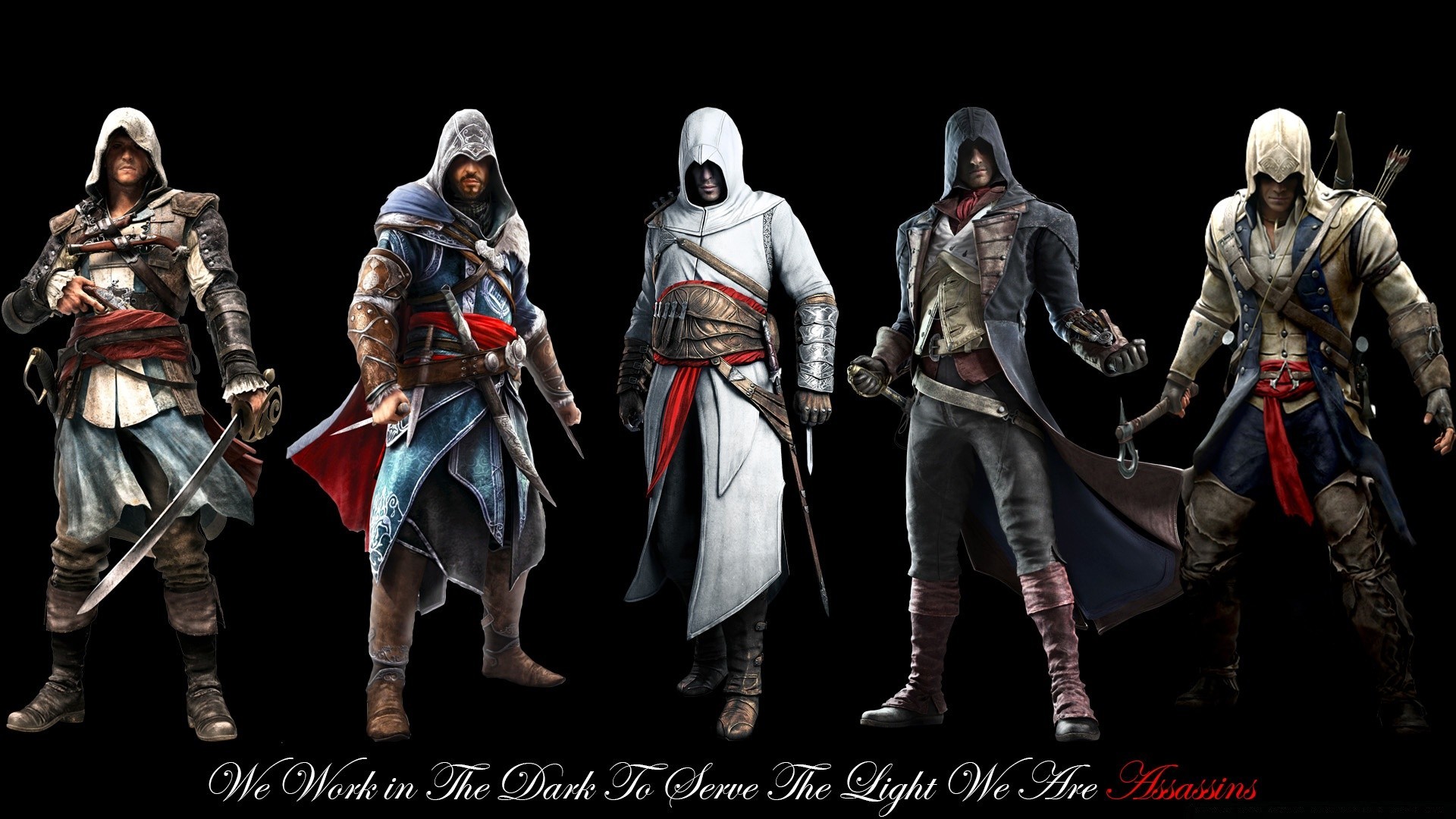 Assassin's creed Charaktere in braunen Kleidern stehen mit anderen Helden