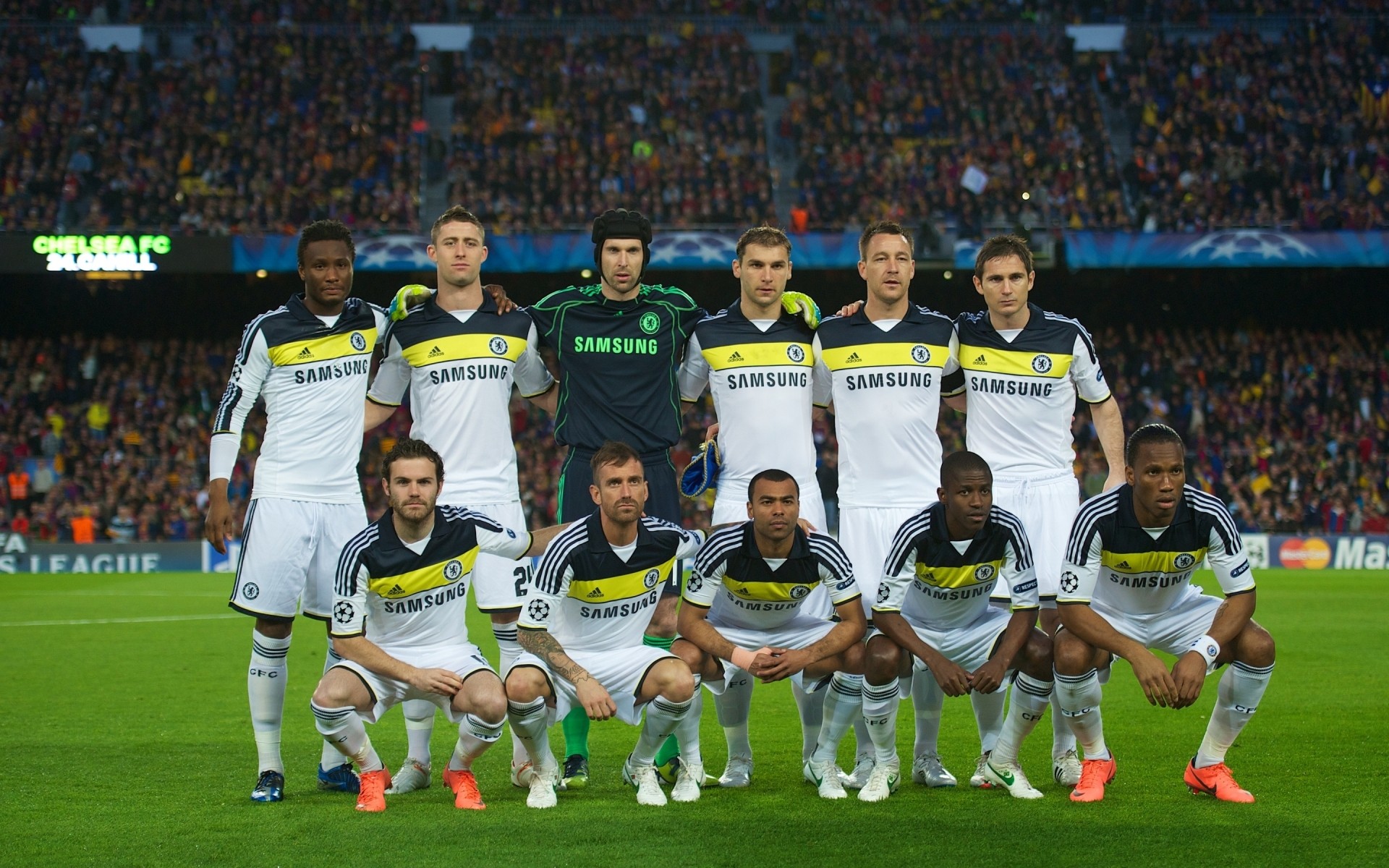 Fußballmannschaft in blauer Uniform auf dem Fußballplatz
