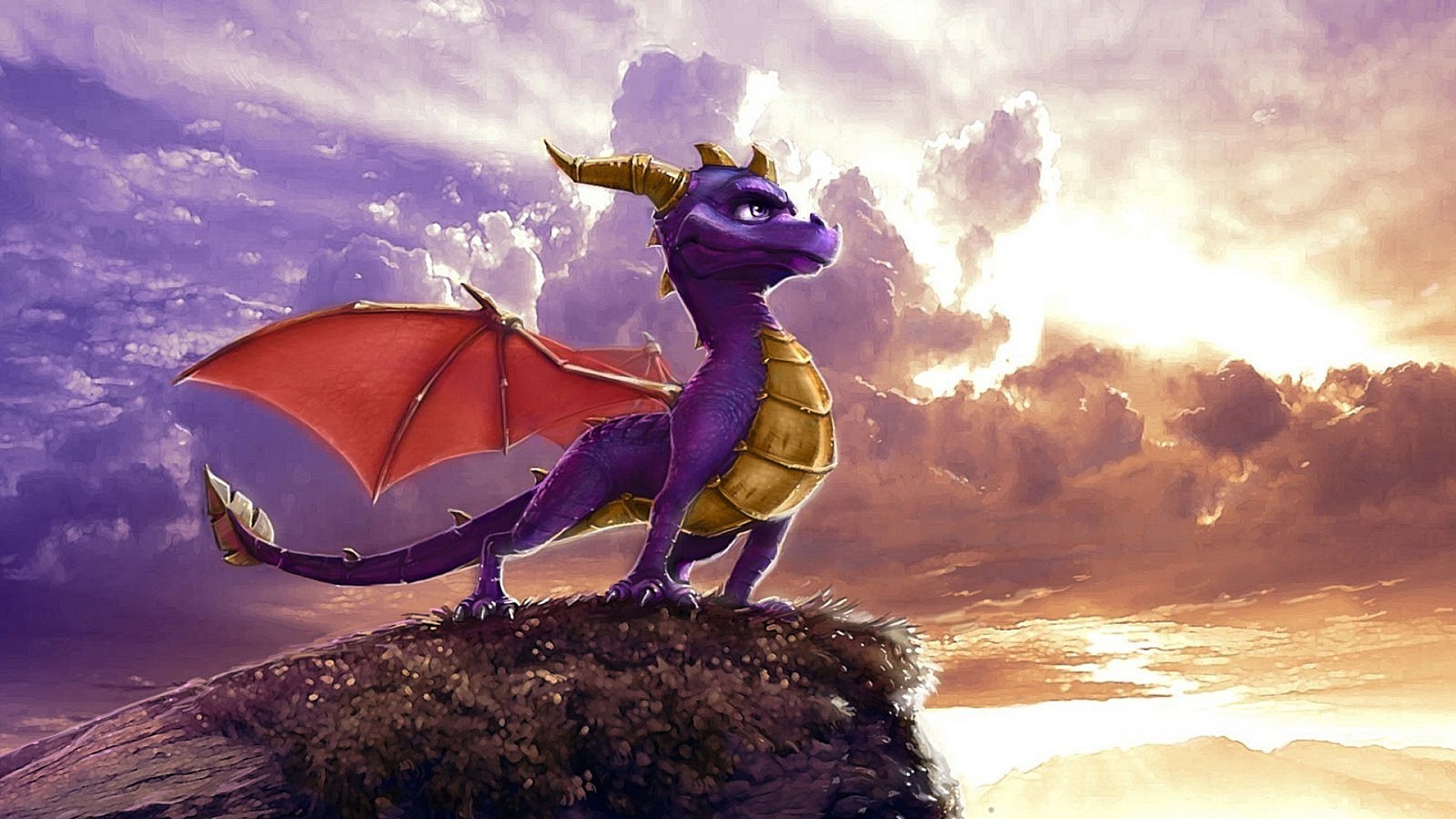 Ein mehrfarbiger geflügelter und gehörnter kleiner Drache, der stolz auf einer Klippe steht