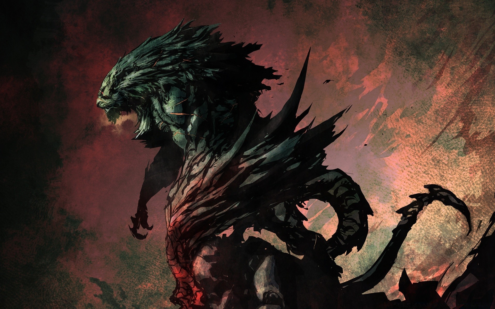 Ein furchterregender stacheliger Drache brüllt vor dem Hintergrund des rauchroten Himmels
