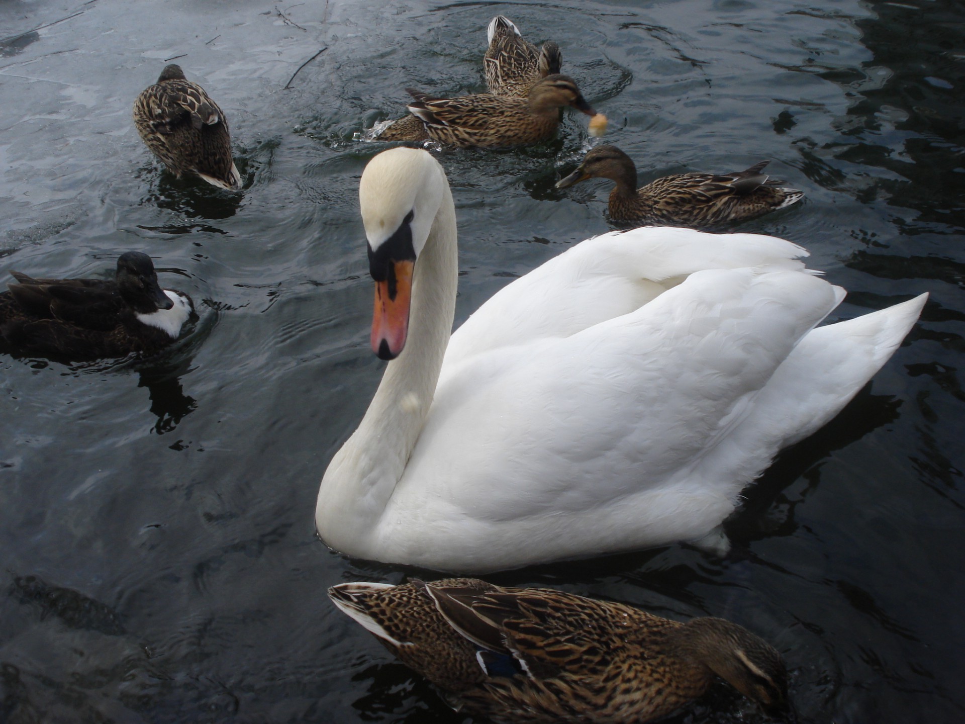 Enten schwimmen auf dem See, und ein Jäger folgt ihnen