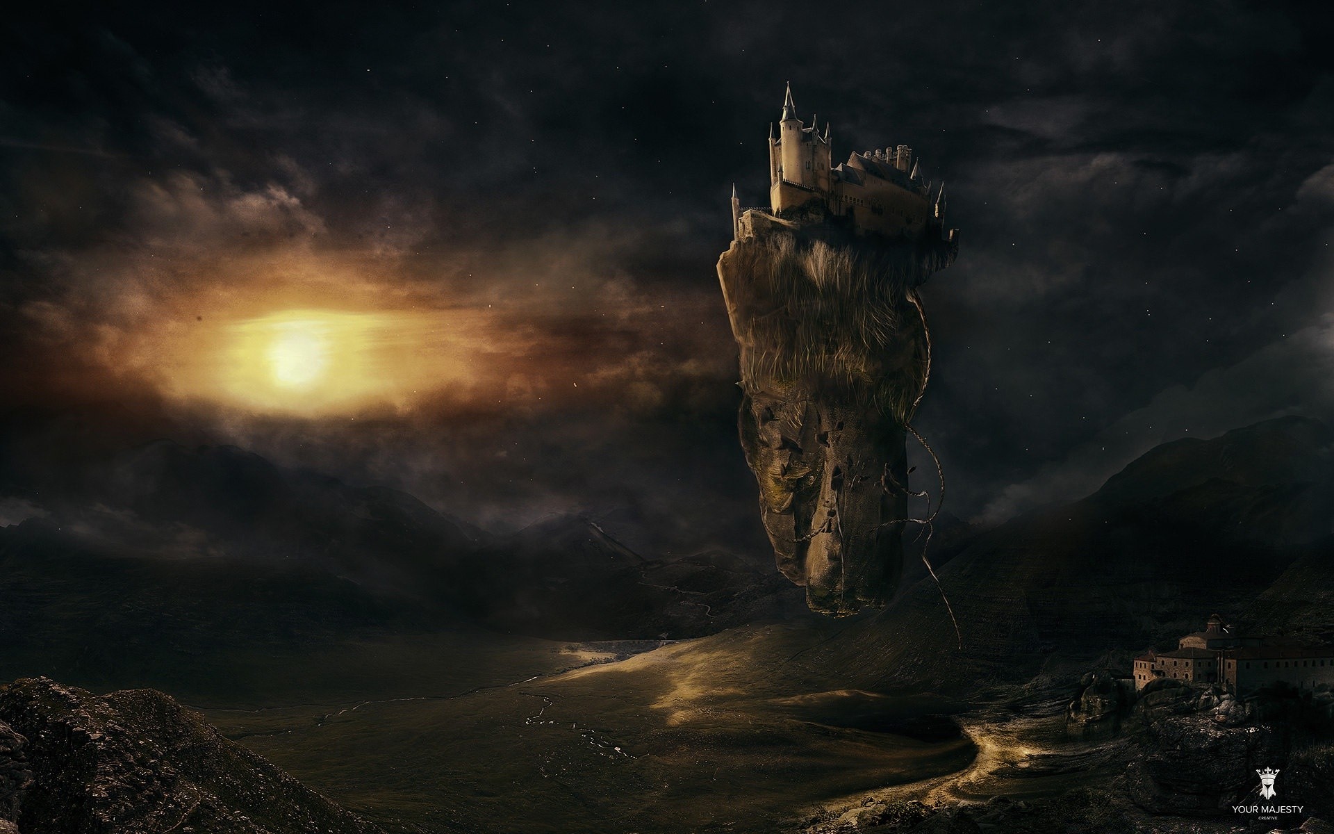 Dunkler Turm auf einem Berg am Meer vor dem Hintergrund eines langen schwarzen Sonnenuntergangshimmels
