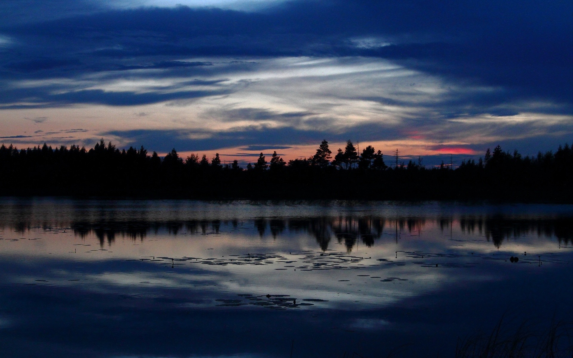 Dunkler sonnenuntergang am ufer eines ruhigen seesDunkler Sonnenuntergang am Ufer eines ruhigen Sees