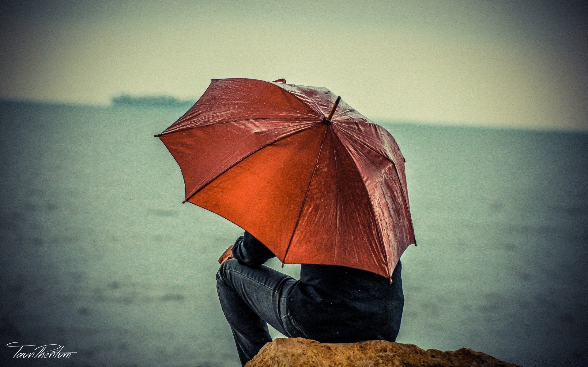 Ein Mann sitzt auf einem Stein am Meer unter einem roten Regenschirm