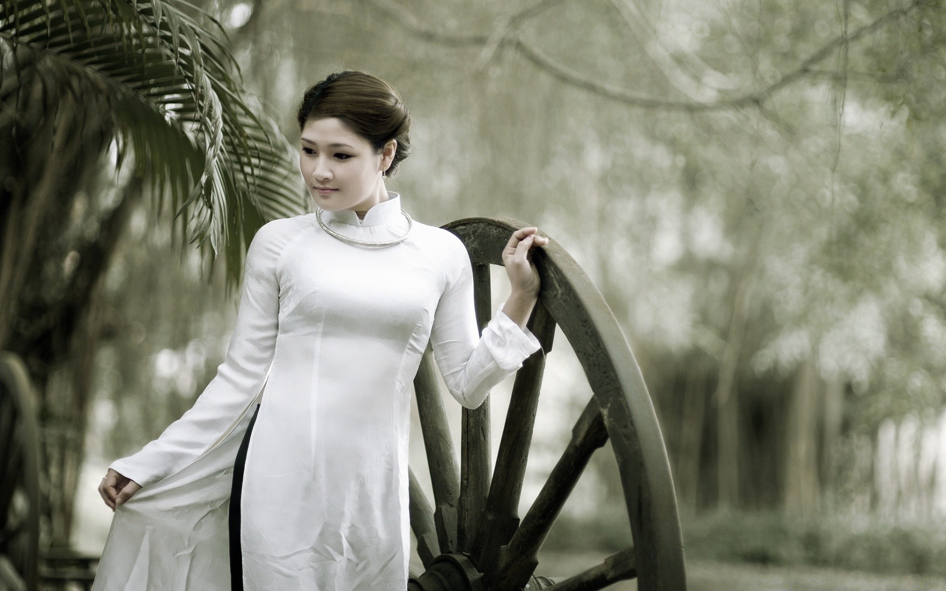 Asiatische Mädchen in einem geschlossenen weißen Kleid lehnt sich mit der Hand an ein großes Holzrad