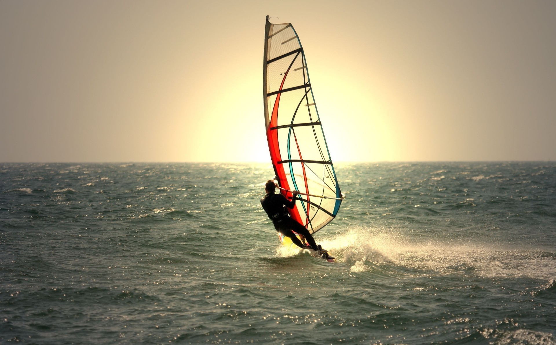 Ein Mann unter einem Segel rast durch die Wellen, um der Sonne zu begegnen
