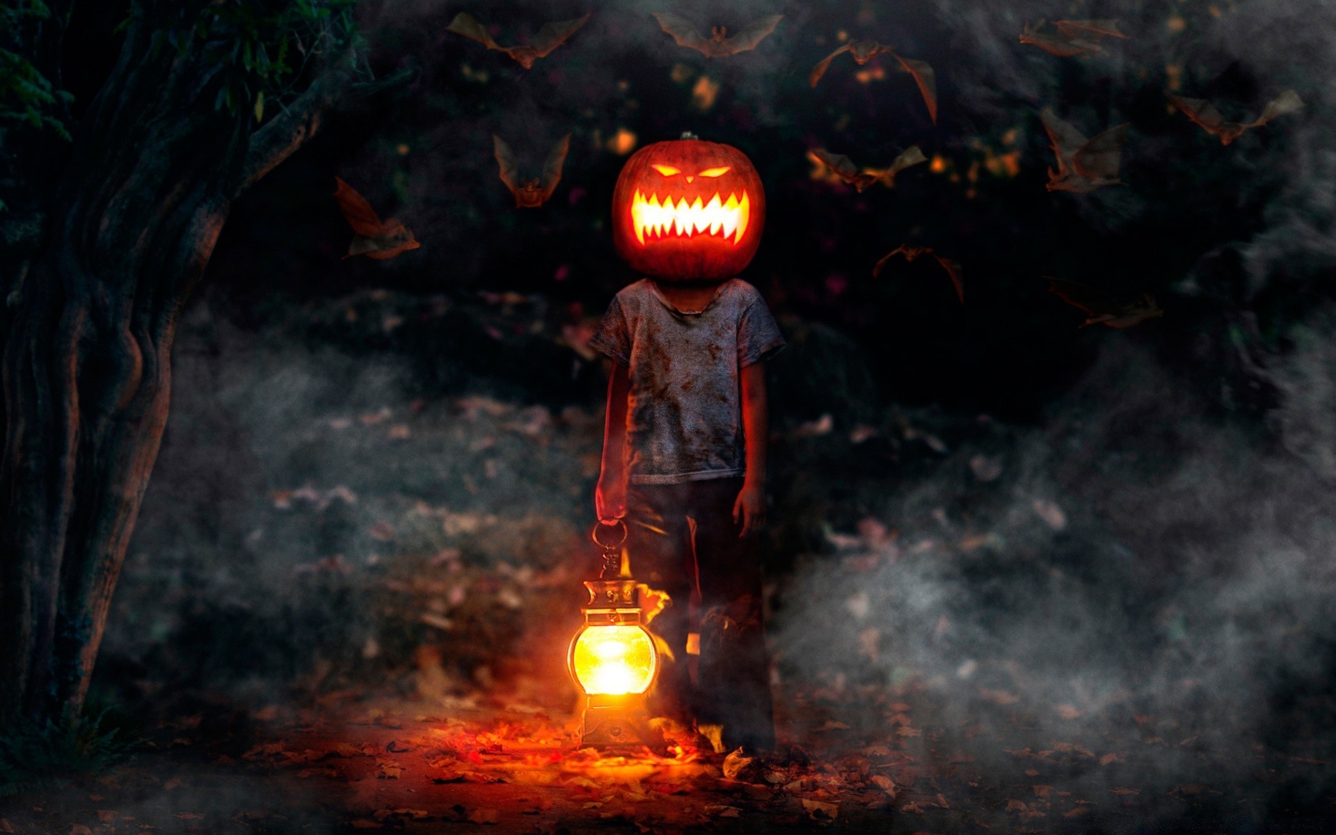 Ein Mann mit einer Laterne in der Hand und einer Kürbismaske