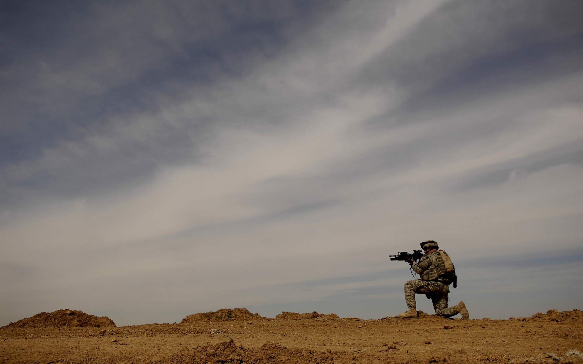 Ein Mann aus der Infanterie steht auf einem sandigen Gelände