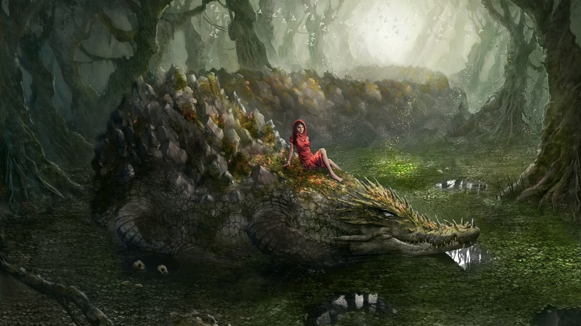 Ein magisches Krokodil trägt ein Mädchen durch einen magischen Wald