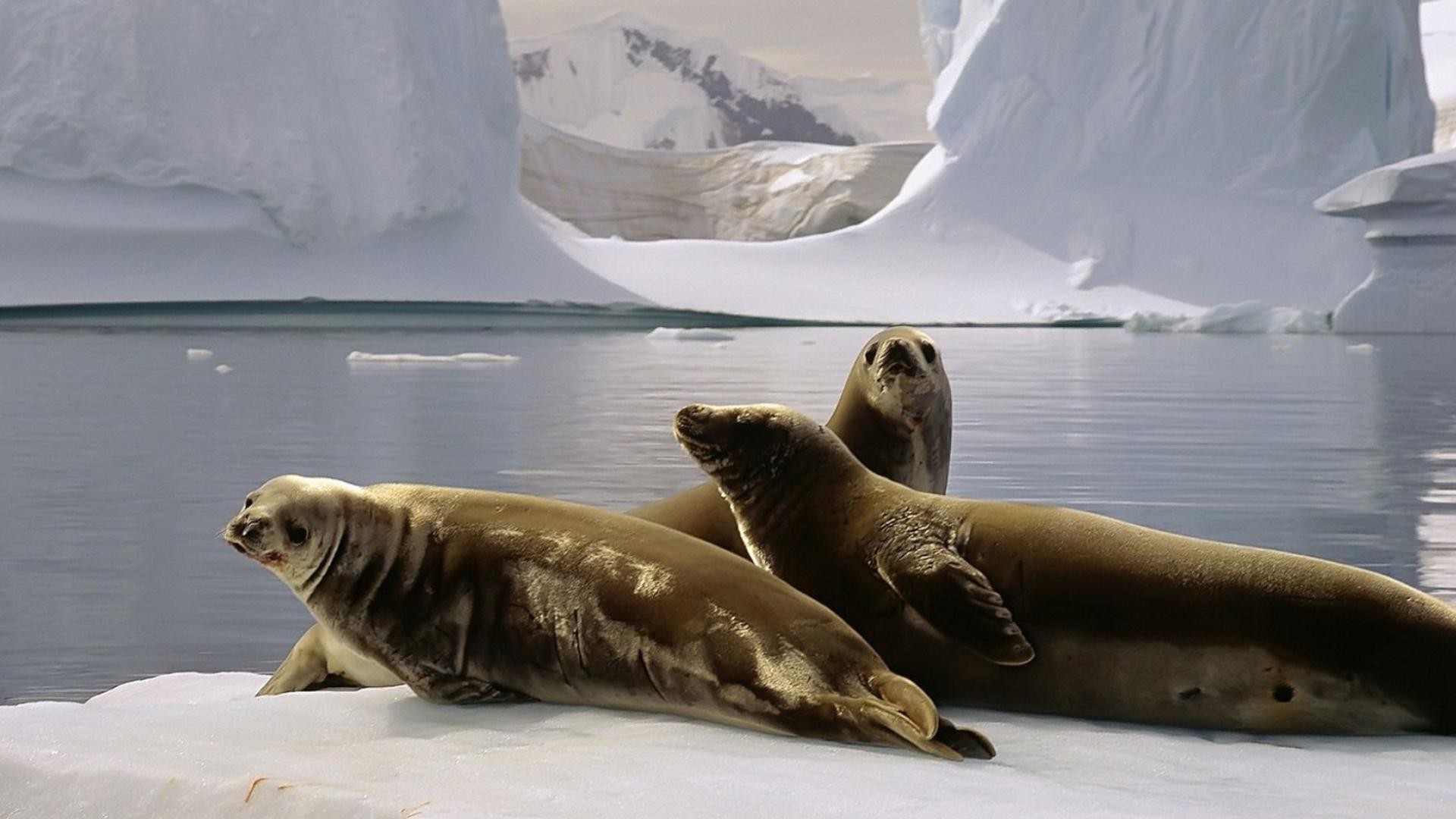 Drei Robben auf einer Eisscholle mitten im Ozean