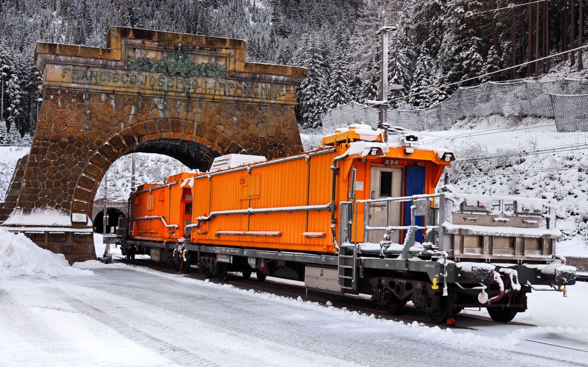 Eine orangefarbene Lokomotive fährt durch einen Bogen