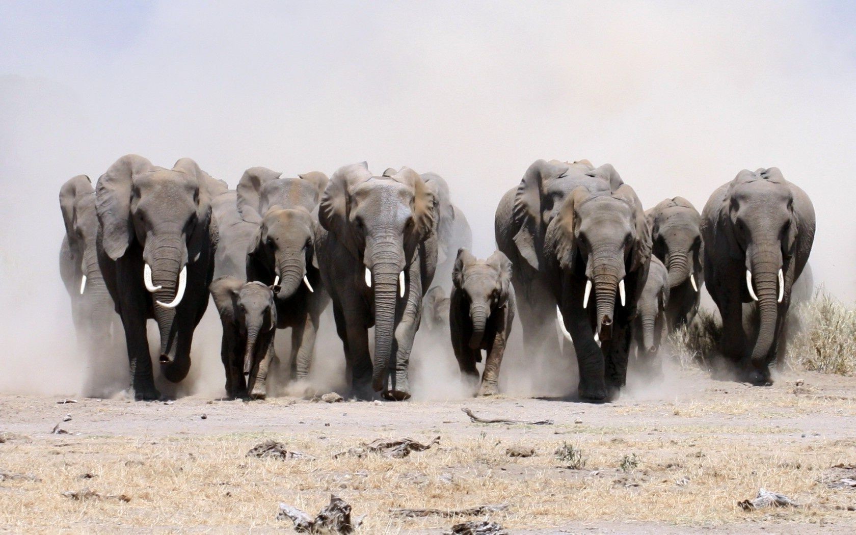 Eine Elefantenherde geht unter dem Licht der untergehenden Sonne in die Nacht