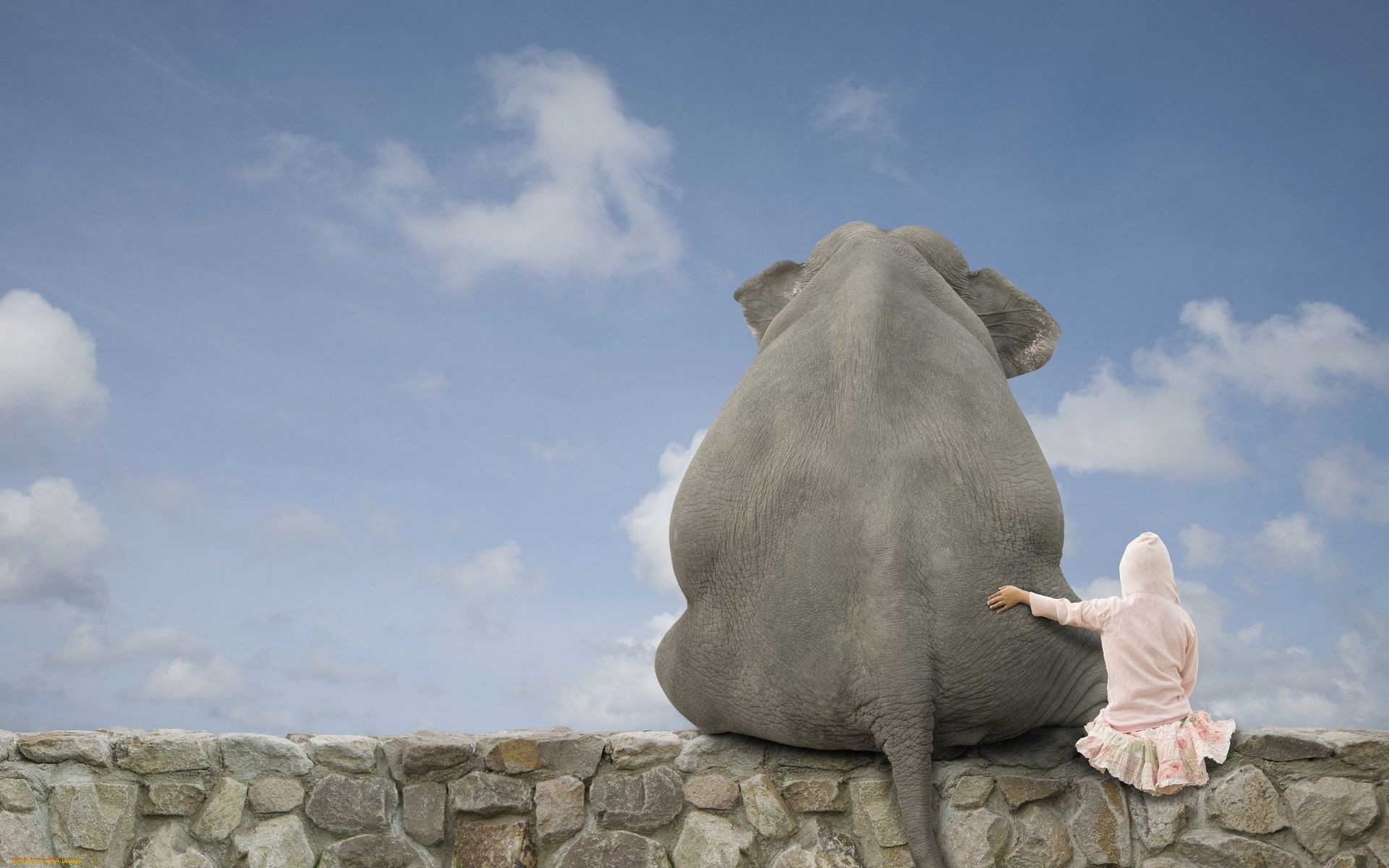 Ein Mädchen in einer Umarmung mit einem Elefanten auf einem Himmelshintergrund