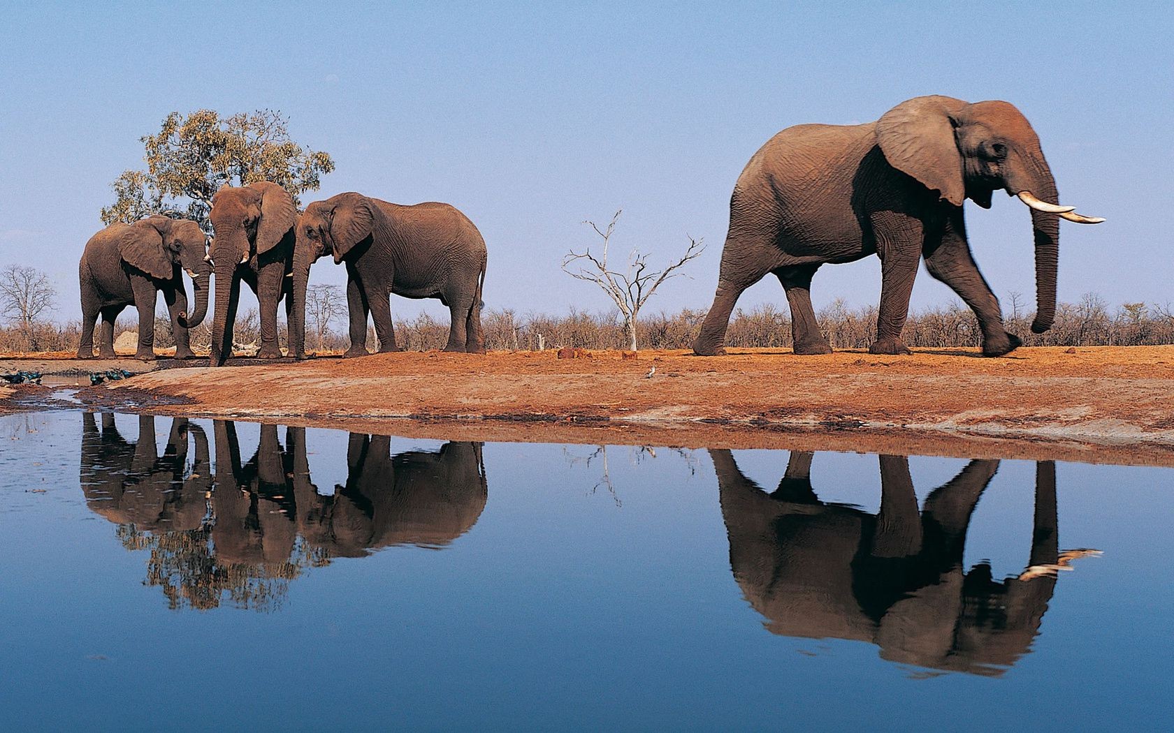 Eine Elefantenherde geht unter dem Licht der untergehenden Sonne in die Nacht
