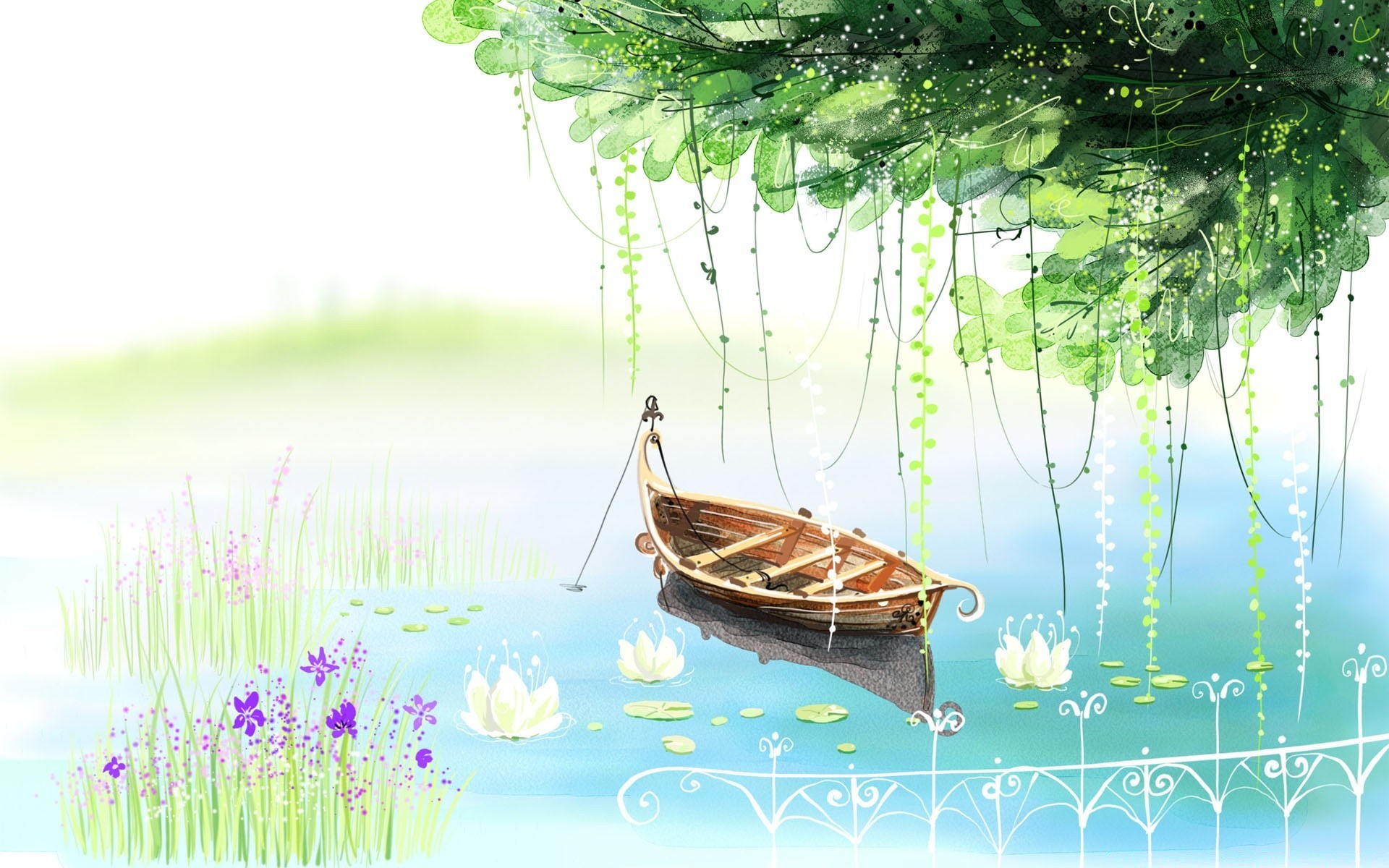 Ein leeres boot, das mit lilien auf einen teich gesenkt wurdeEin leeres Boot, das mit Lilien auf einen Teich gesenkt wurde