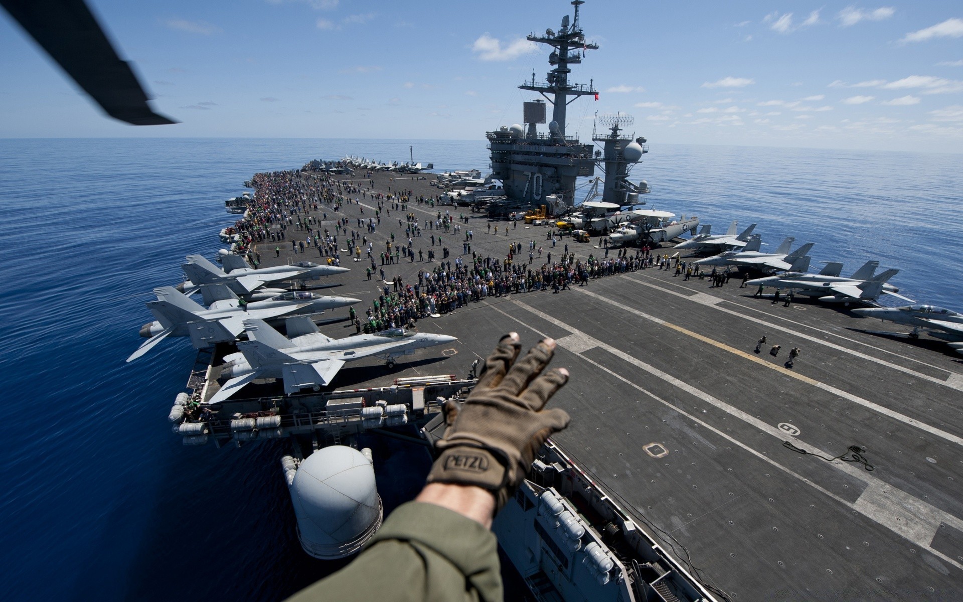 Blick aus dem Hubschrauber, der auf einem Flugzeugträger landet