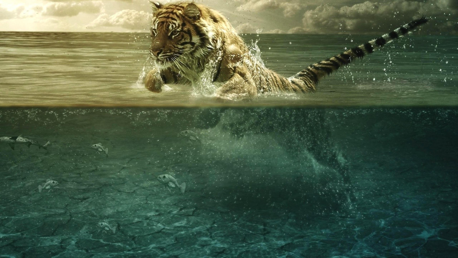 Der Tiger springt aus dem Wasser und hebt das Spray auf