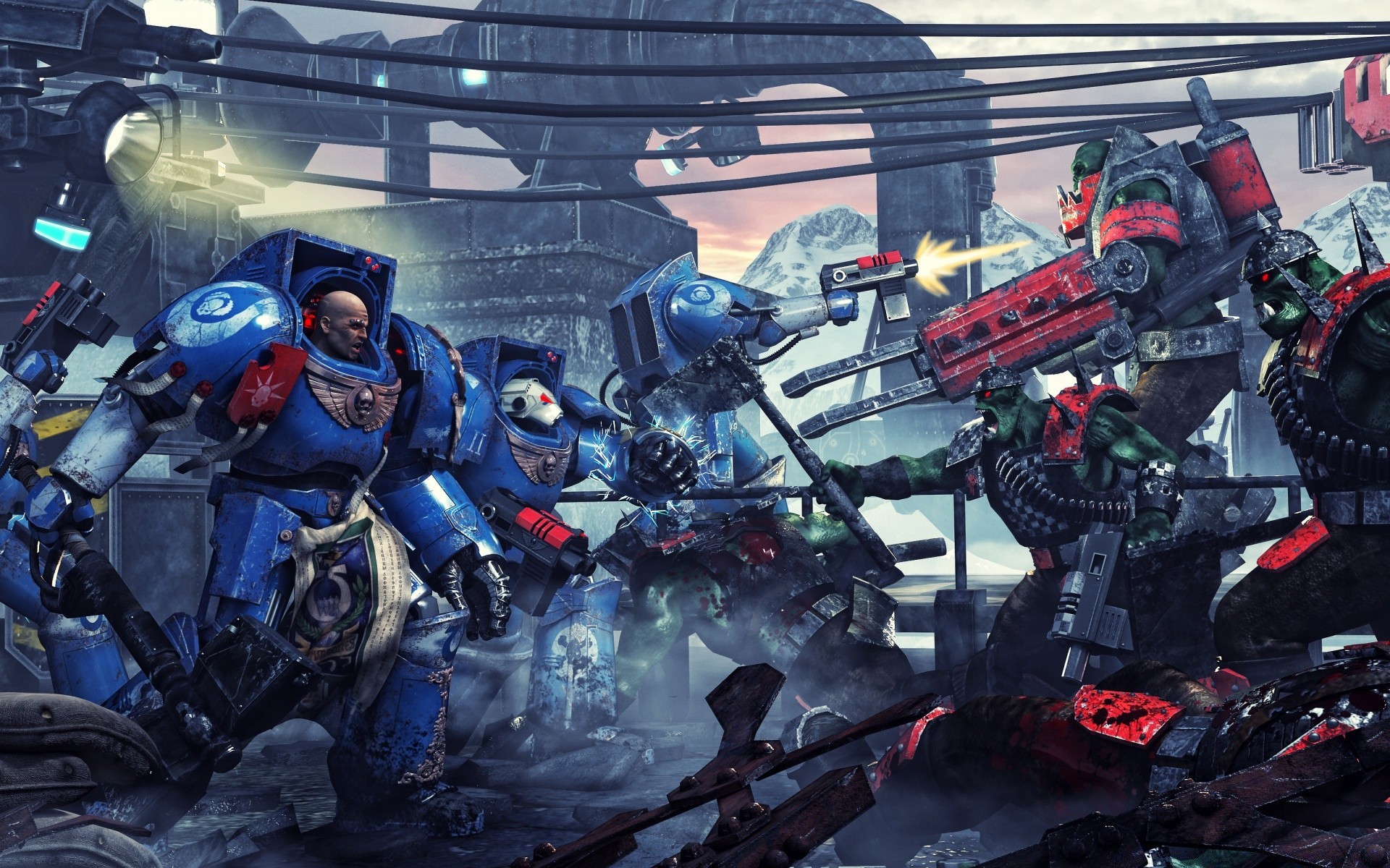 Szene aus dem warhammer-spiel blau-rote kostüme