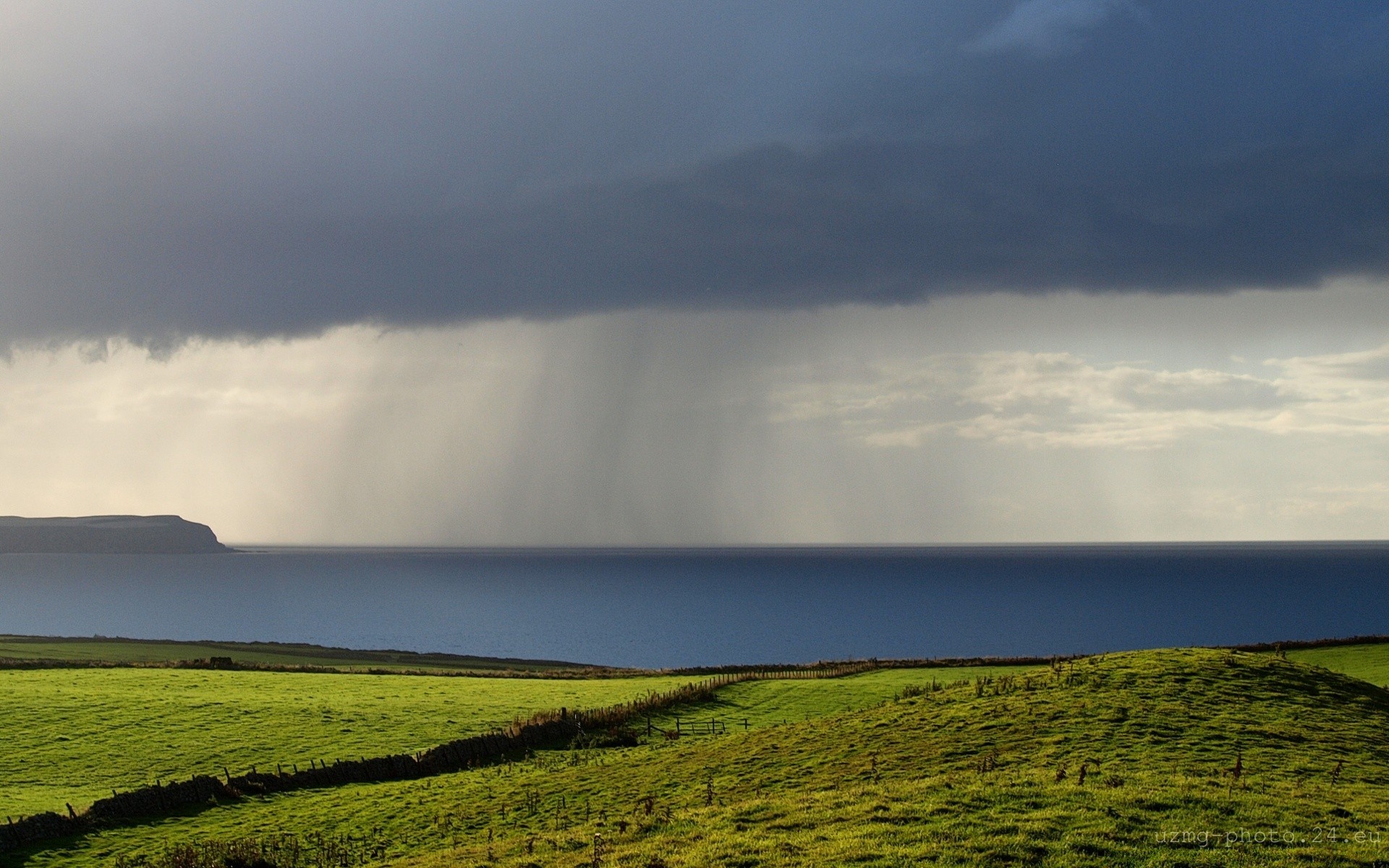 Landschaft von grünen Wiesen und Wolken , aus denen es regnet