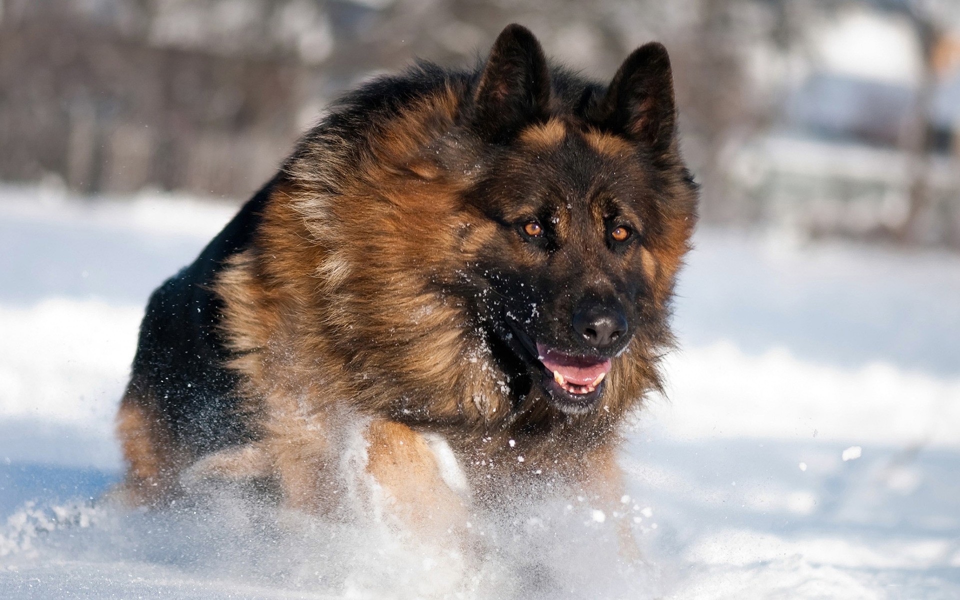 Ein großer Schäferhund läuft durch den Schnee