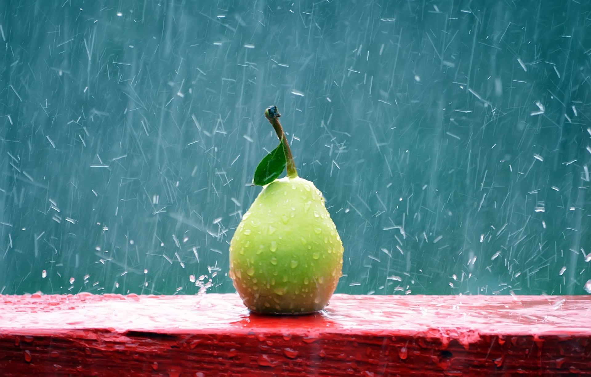 Eine einsame Birne unter starkem Regen
