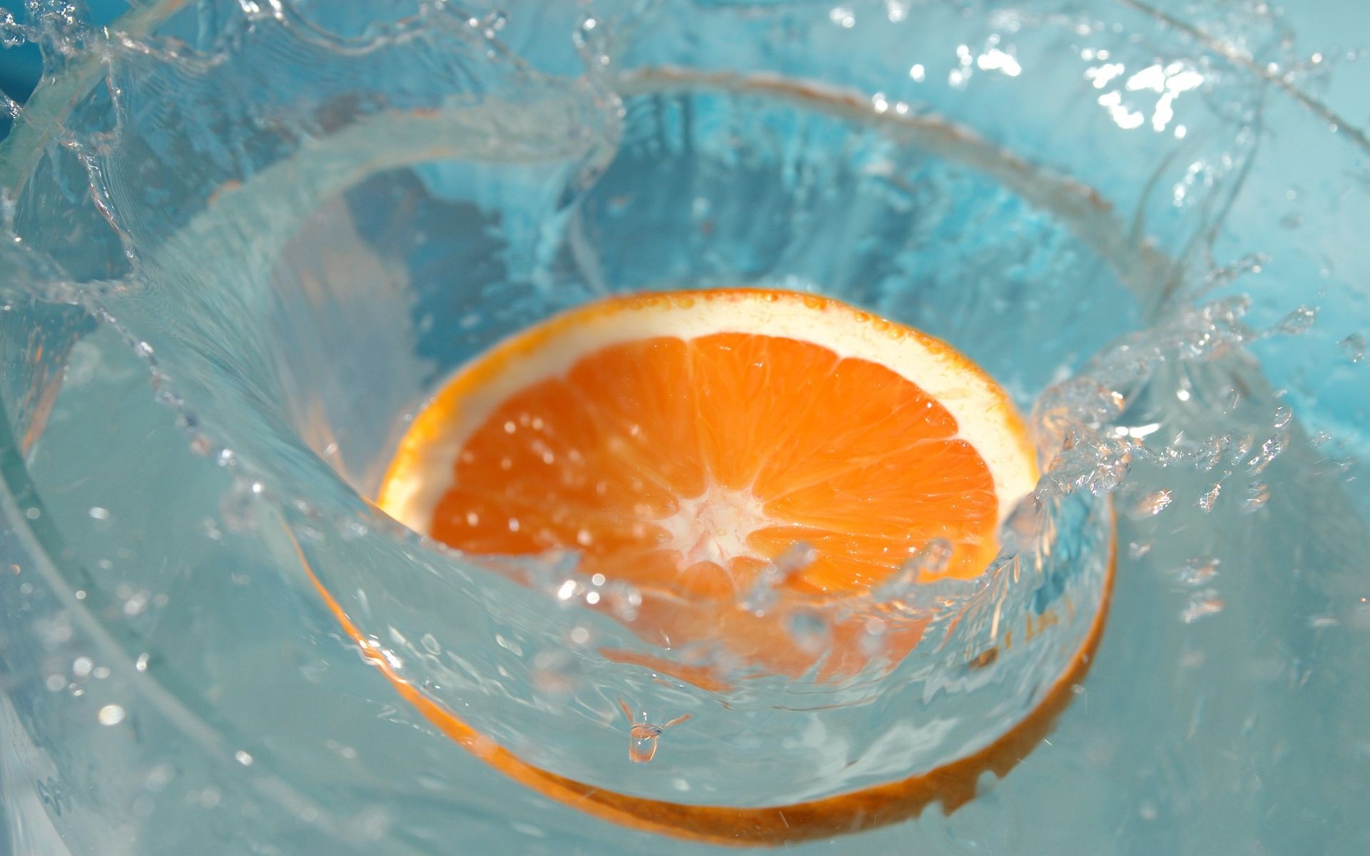 Eine Orangenscheibe fällt ins Wasser