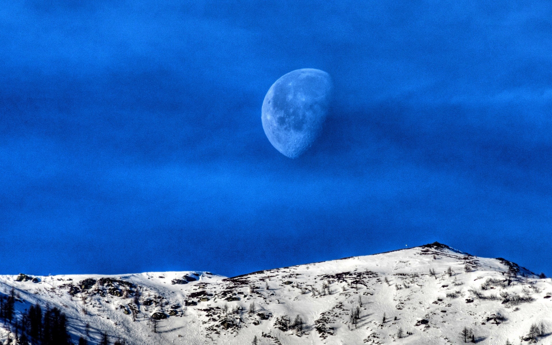 Mond auf dem Hintergrund der schneebedeckten Berge