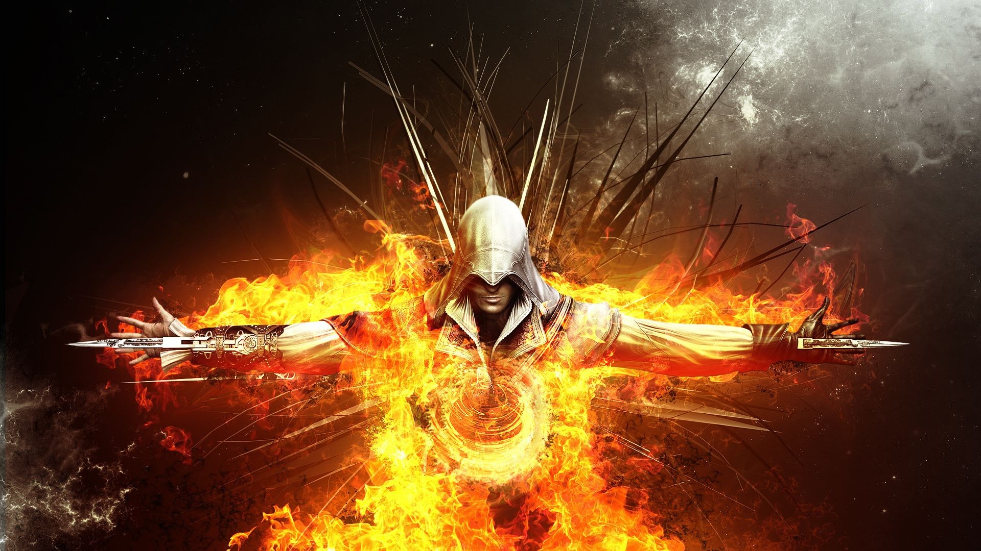 Ein männlicher Krieger vor dem Hintergrund von Feuer und Rauch. Fantasy-Bild auf dunklem Hintergrund
