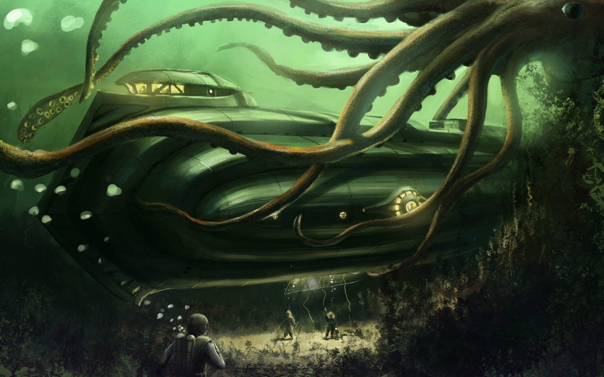 Ein Drache mit Flügeln, der an Vögeln und Fischen vorbeifliegt