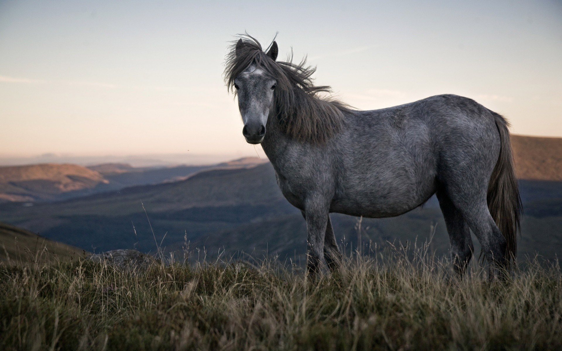Ein ungewöhnliches Pferd in grauer Farbe vor dem Hintergrund der schönen Natur