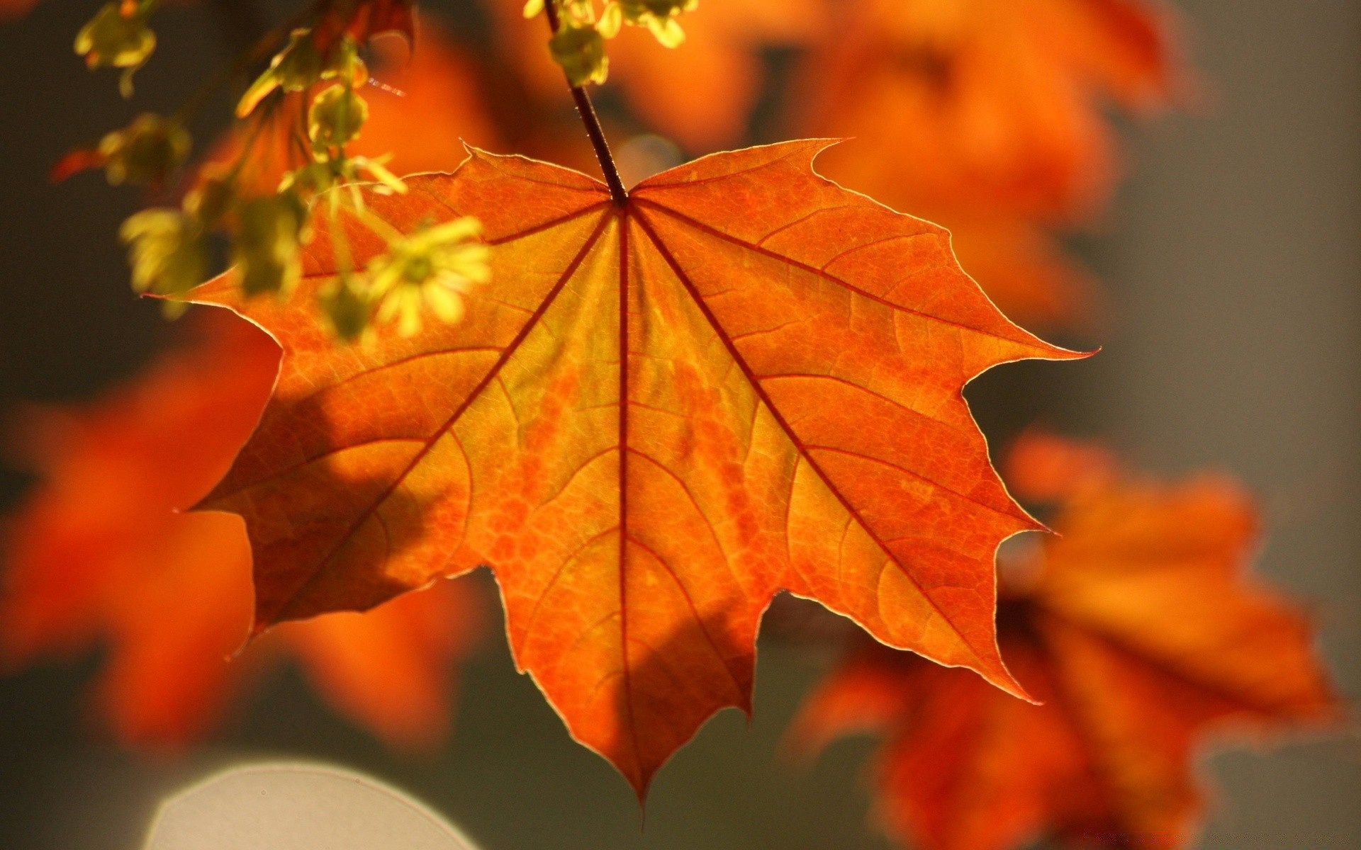 Große orangefarbene Ahornblätter und kleine Blüten