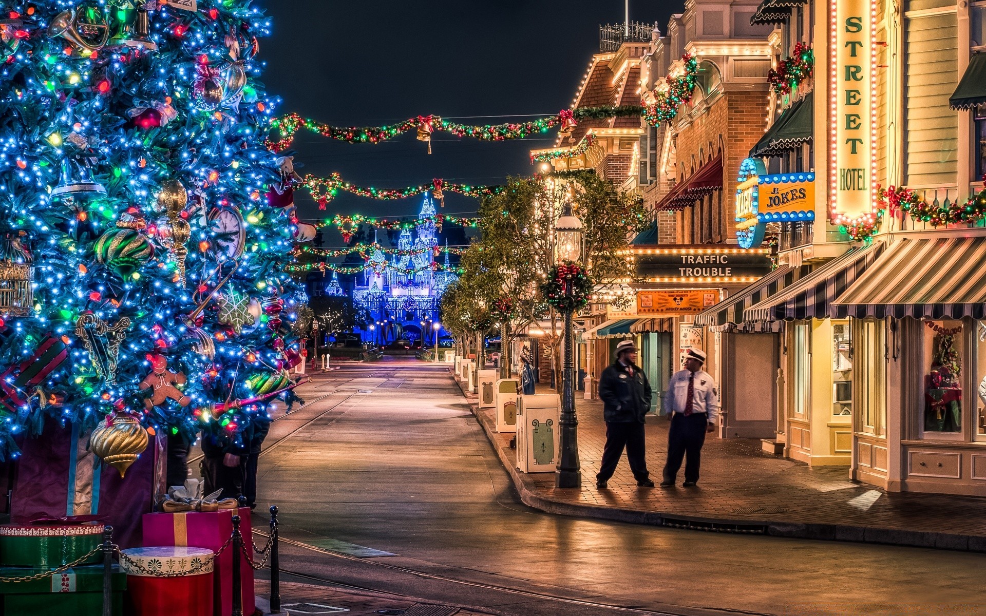 Weihnachtliche Abendstraße mit Lichtern geschmückt