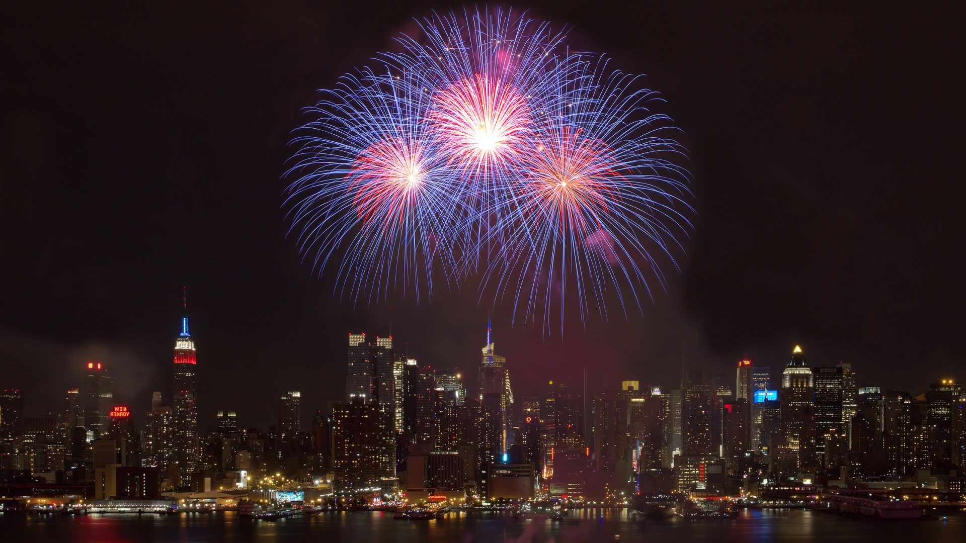 Festliches Feuerwerk über den Wolkenkratzern der Stadt