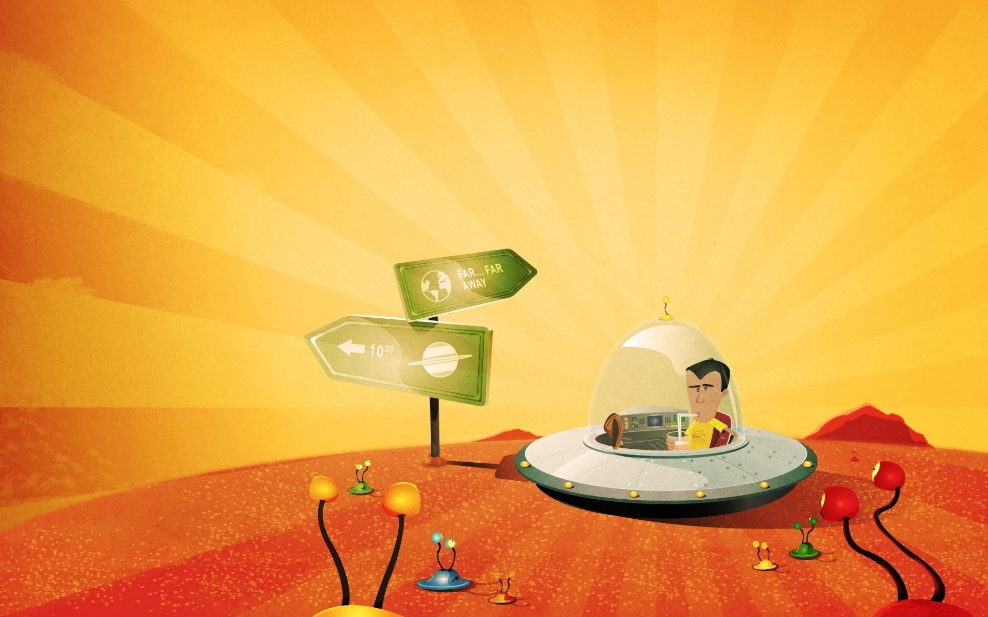 Ein cartoon-mann in einer fliegenden untertasse steht auf einem roten feld