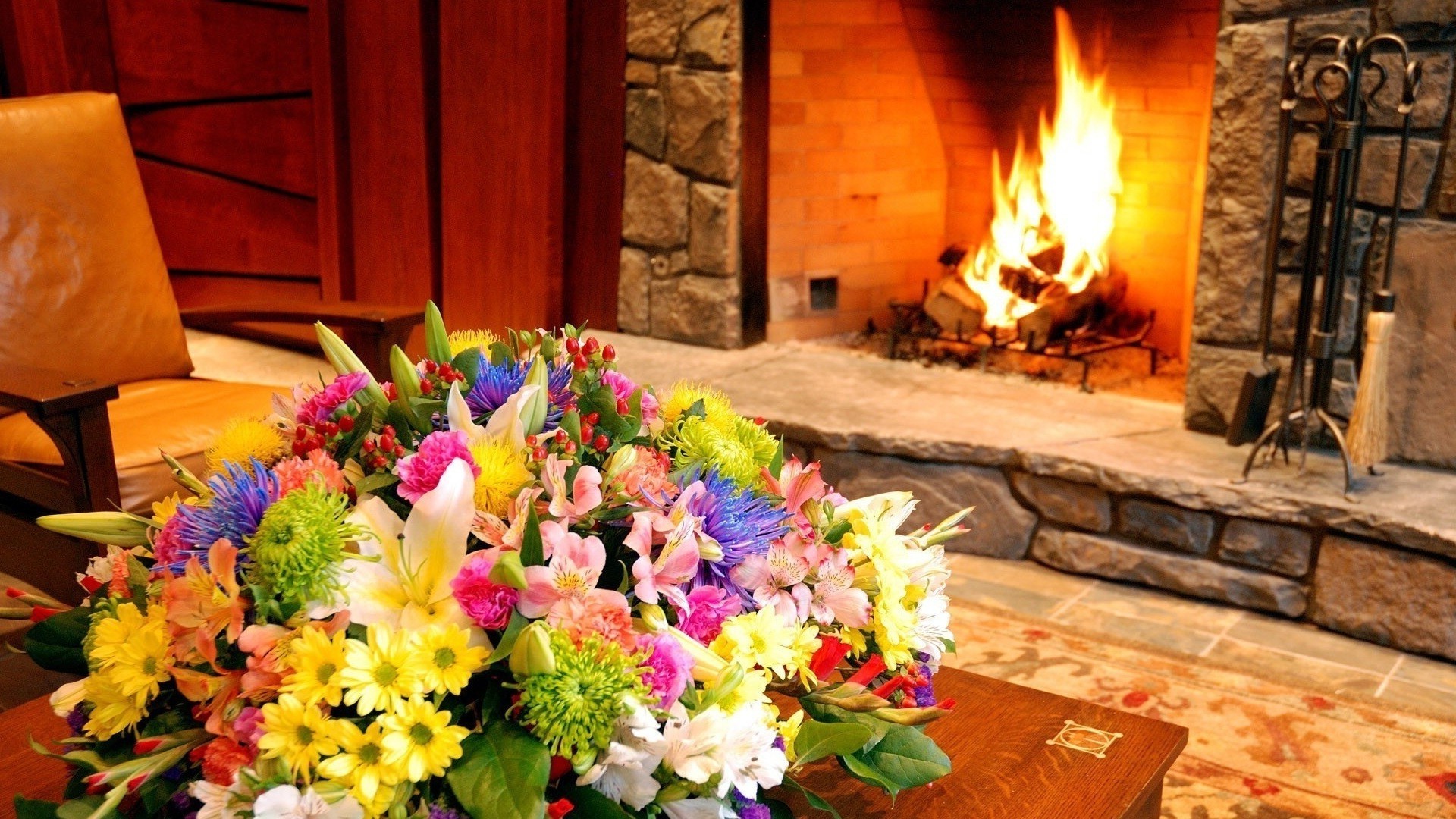 Gemütlicher Kamin und schöne Blumenzusammensetzung