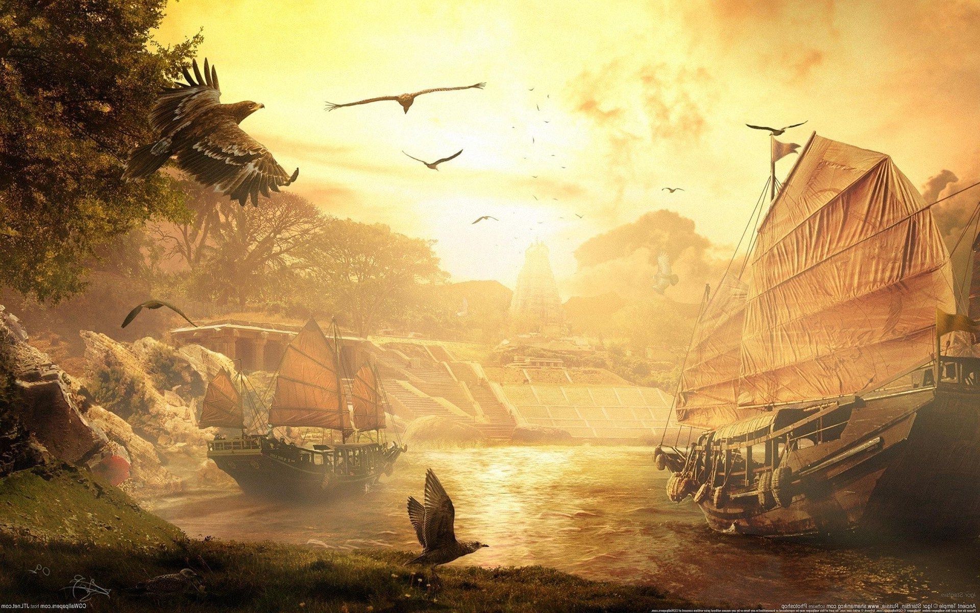 Meer, Schiffe und Adler am Himmel