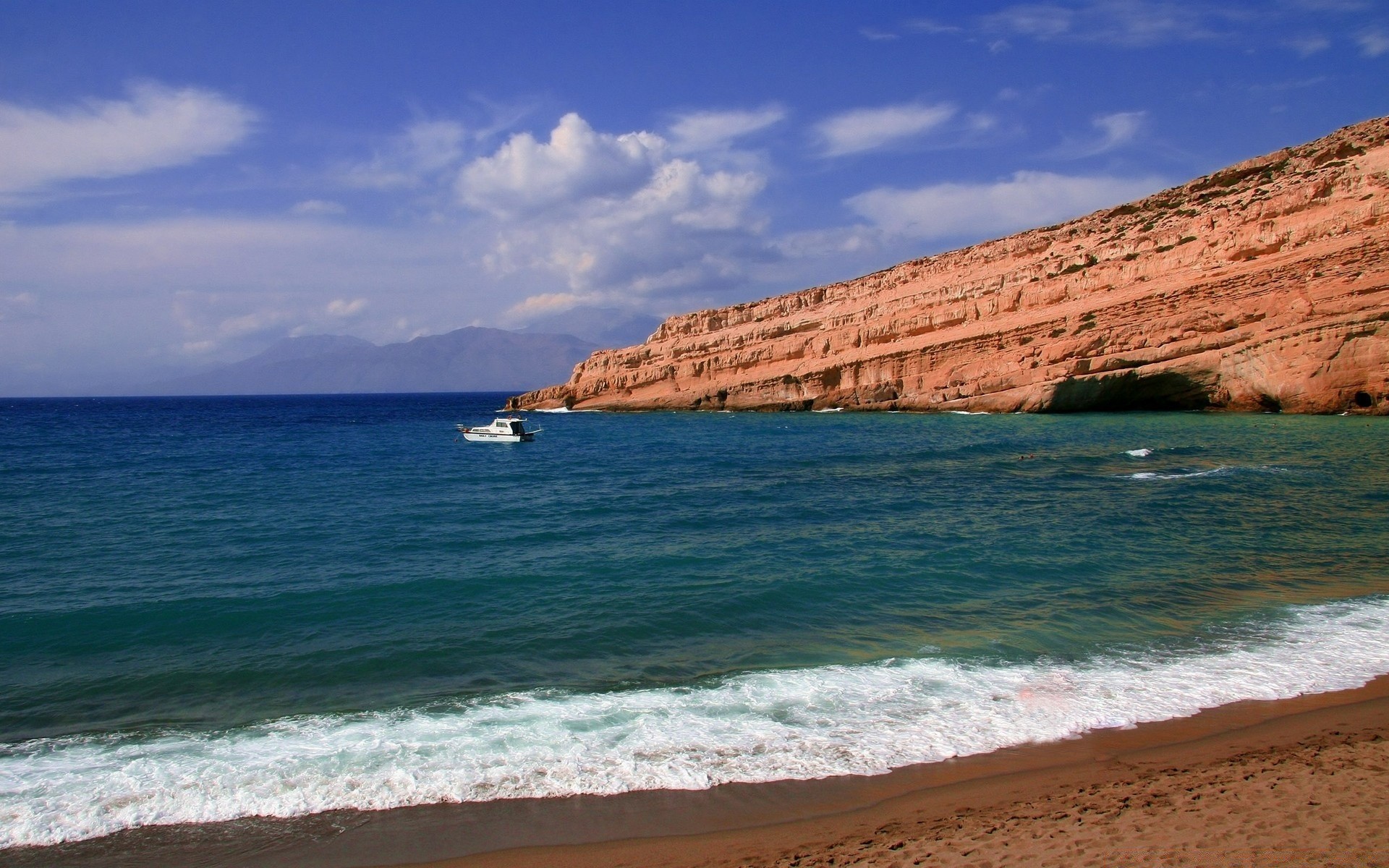 Blaues Meer und Himmel, Strand und Höhle am Felsen