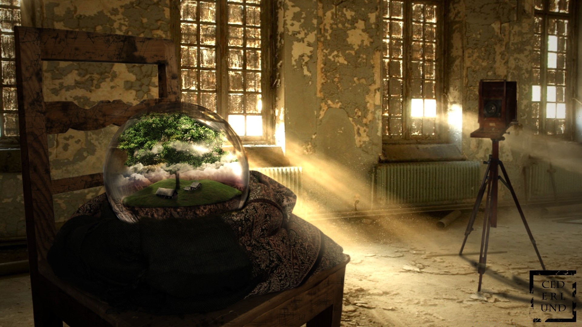 Fenster mit dunkler Landschaft auf schwarzem Hintergrund