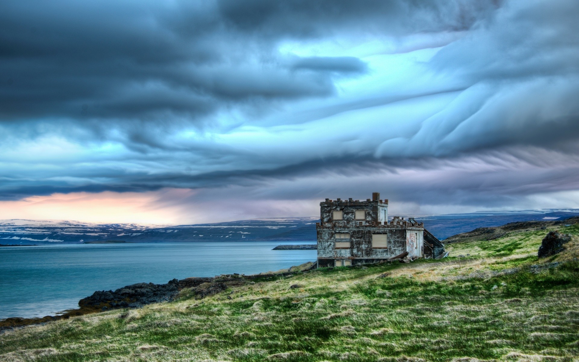 Morgendämmerung auf einer Siedlung am Fuße der Berge