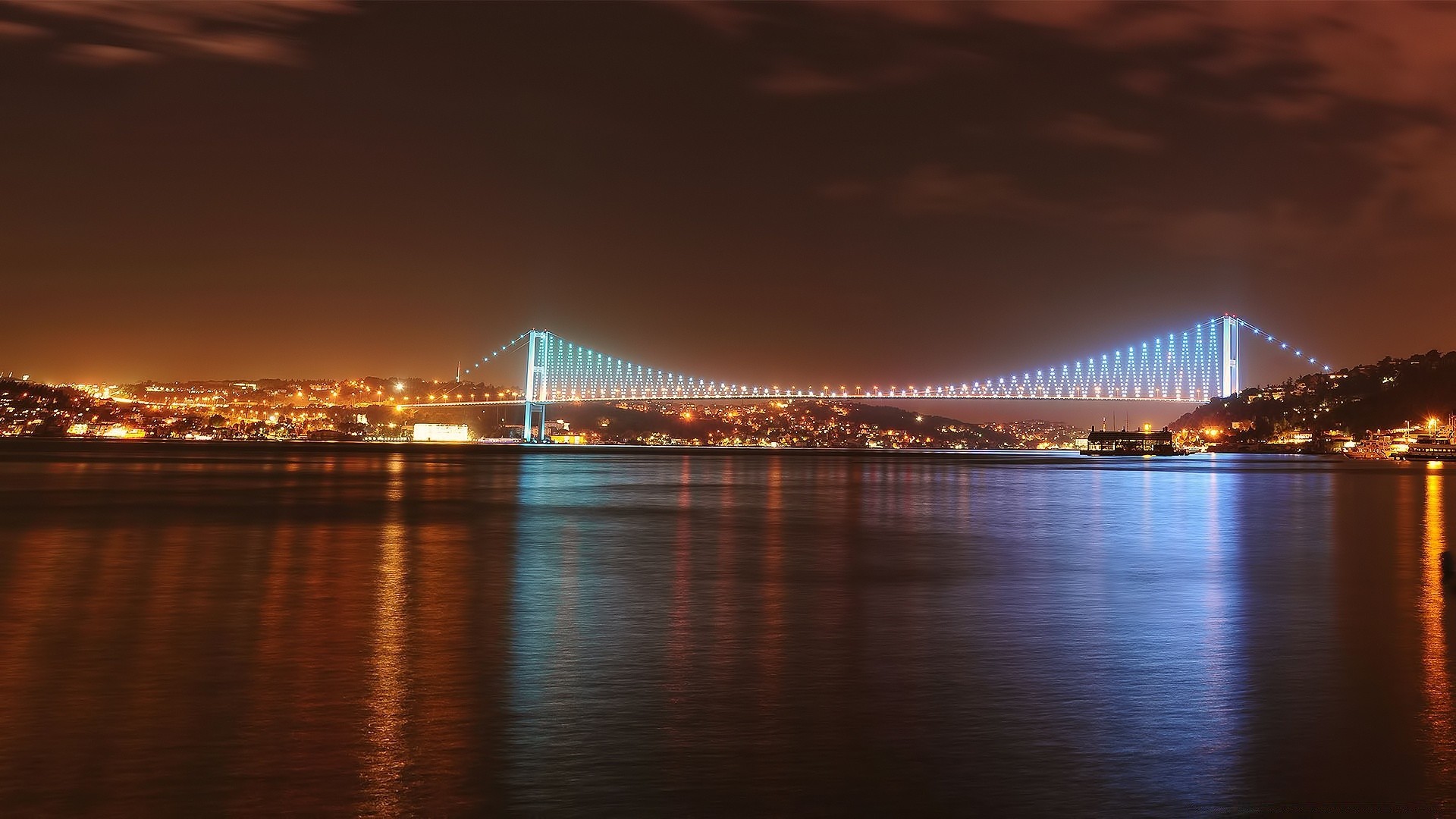 Ein düsterer Sonnenuntergang über einer leuchtenden Brücke