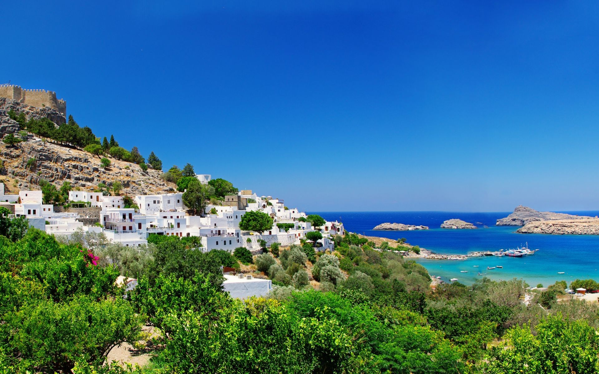 Greece Landschaft Festung Küste Häuser Bäume Natur
