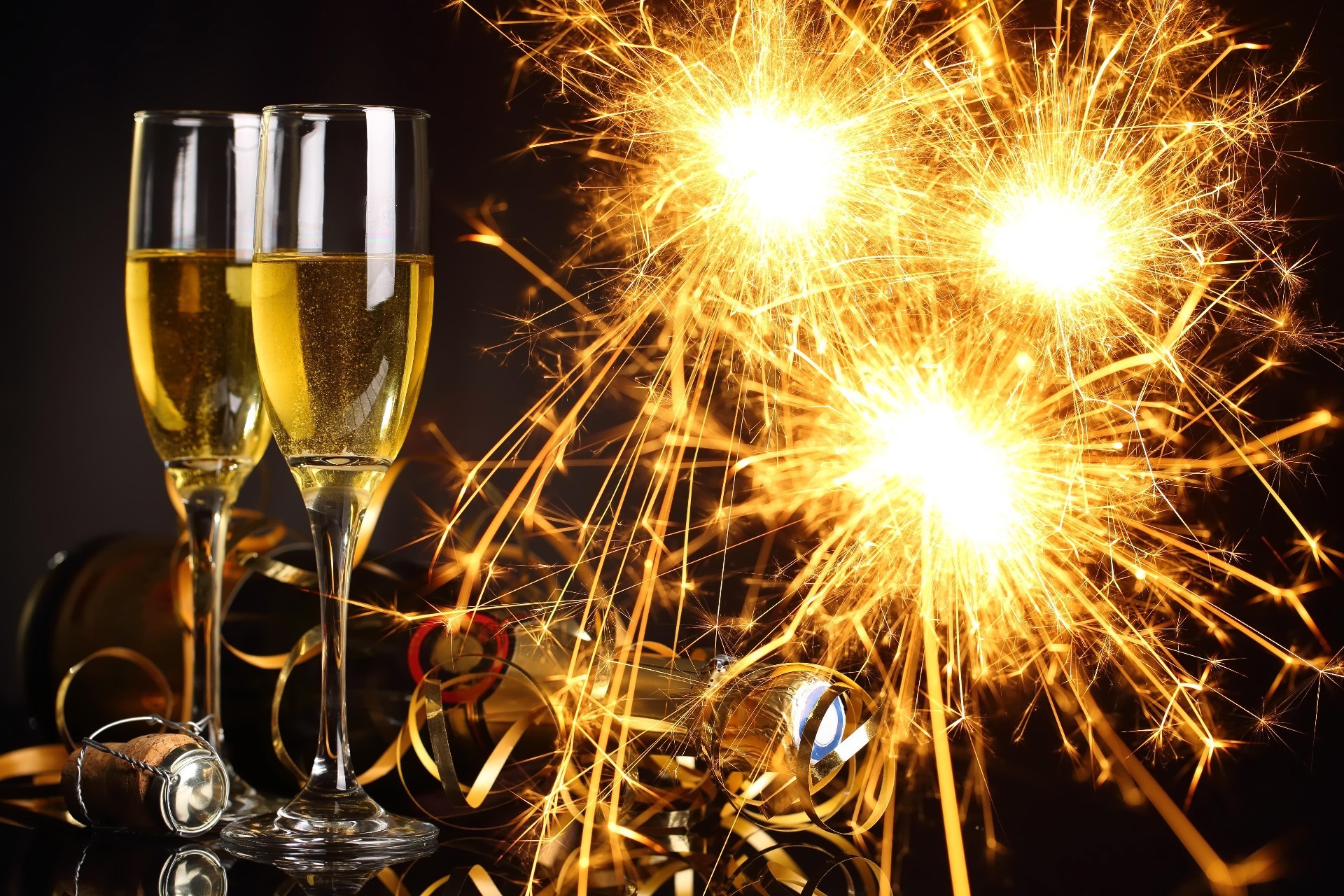Funkelnde Wunderkerzen und zwei Gläser Champagner