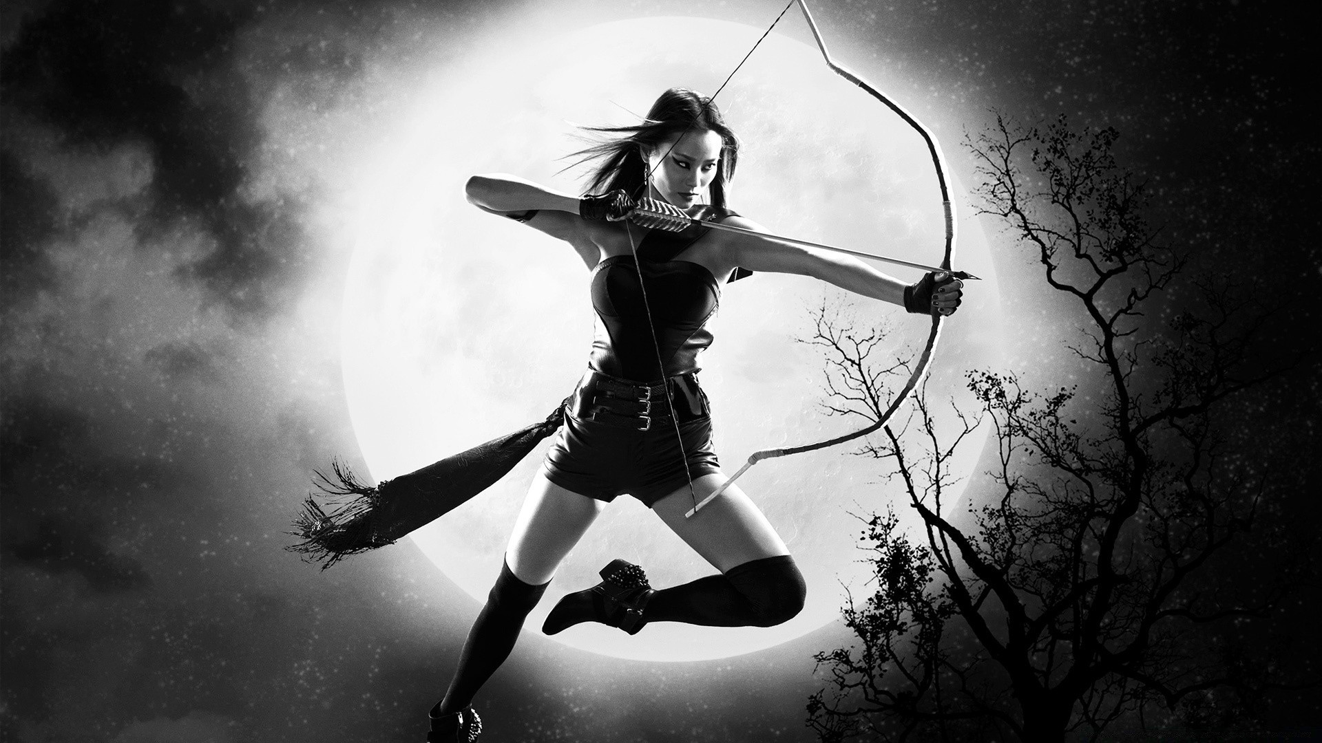 MÄDCHEN - BOGENSCHÜTZIN IN AKTION VOR DEM HINTERGRUND DES MONDES